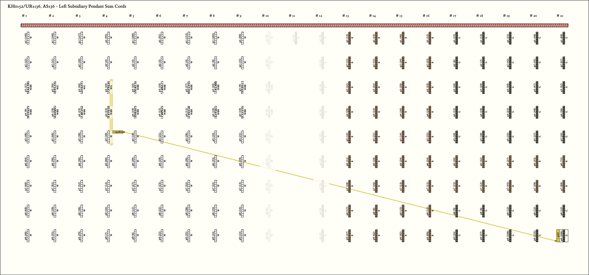 - The khipus can be oriented so that they have a common color pattern. The pattern separates the 9 pendants in a group into 2, 2, and 5 pendants with the first 2 and last 5 being the same color. In 5 of the groups of KH00146, the remaining 2 pendants are also the same color. But, in most of the other groups, those 2 pendants are the same color as each other but different from the rest of the group.