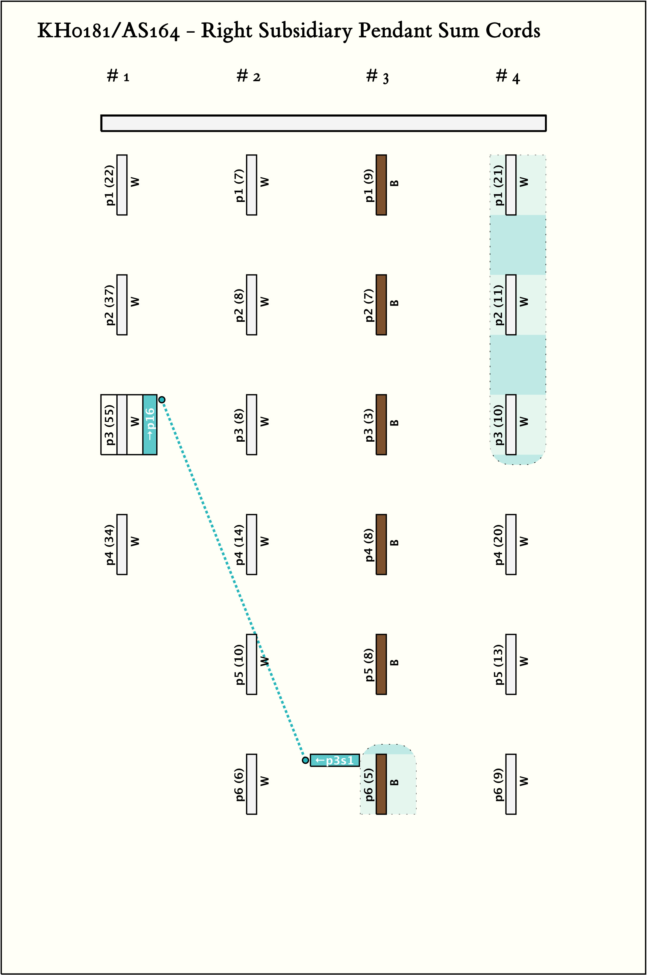 - Construction note: The positioning of the knot clusters is not standard. Rather than having all long knot clusters aligned and all single knot clusters aligned, the first knot cluster used is in the highest position. Values have been assigned assuming that the knot cluster positions are "top justified" rather than the usual which is "bottom justified." For example, we usually write numbers "right justified" but can write them "left justified" also. Thus: