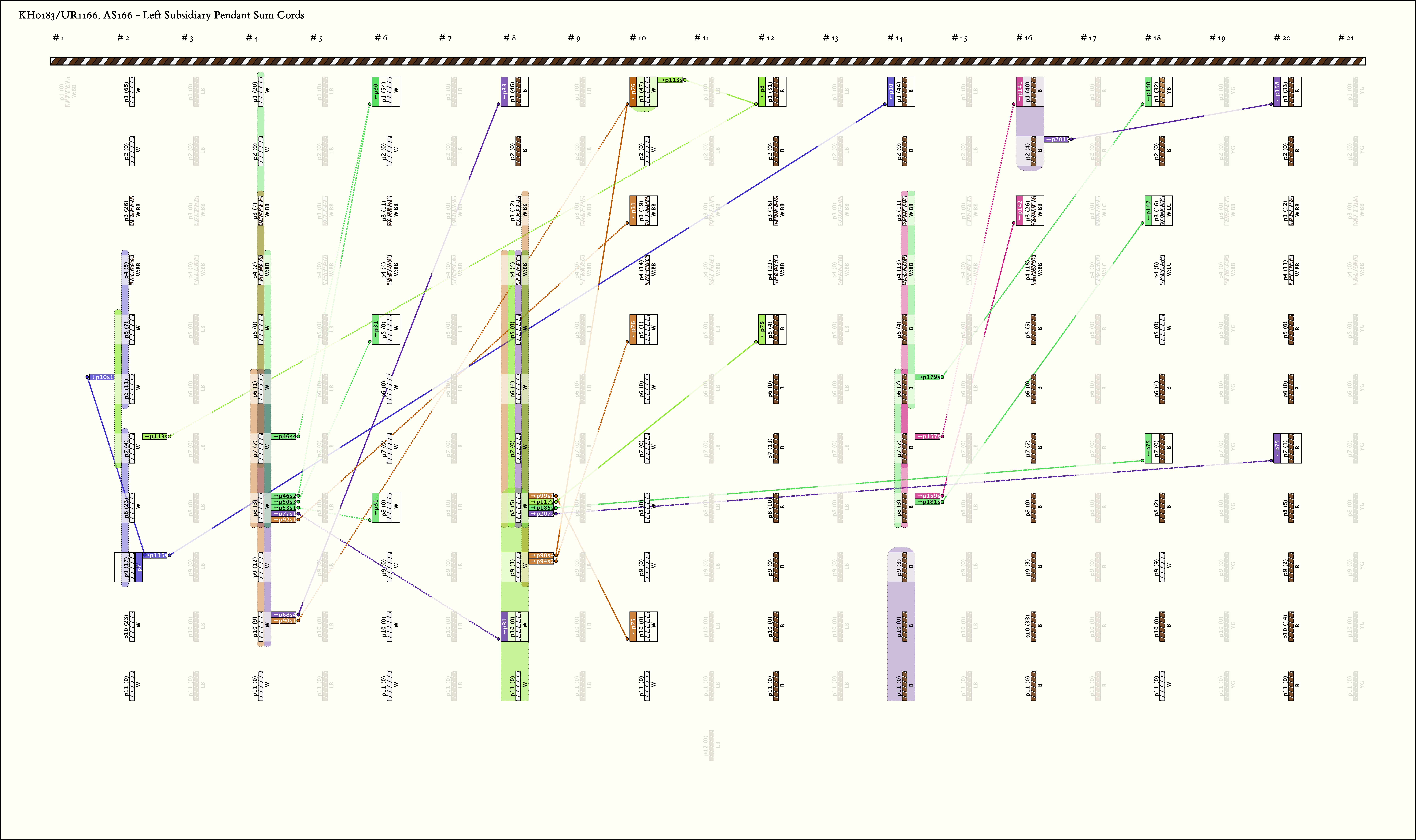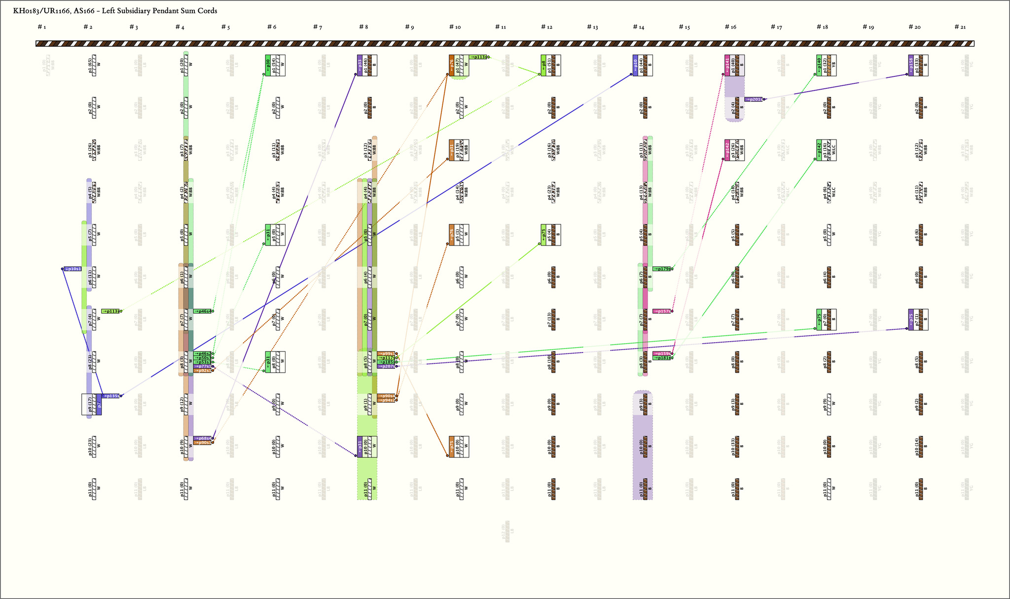 - Construction note: The twisted ends of the main cord and first cord are linked together. Cord 1 is shorter than the other pendants and bound with thread at its end. 2.Construction note: Subsidiaries attached to the first subsidiary on pendants 2, 24, 135, 157, 179, and 201 are attached in a non-standard way. They are looped around both the pendant and subsidiary to which they are connected.