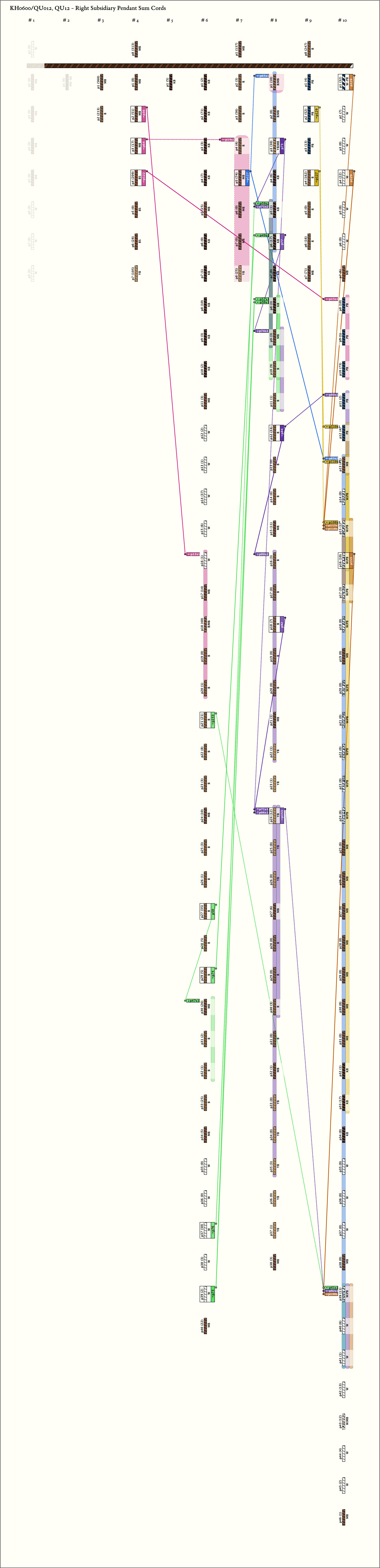Khipu is sewn down to mount board on all pendants and they are overlapping each other. Some cord relationships were unclear as a result.
