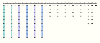 - Each group is unified by color. In part 1: group 1 is CB-W or CB-B; groups 2 and 6 are DB-W; groups 3 and 4 are CB-W; and group 5 is CB. The markers between them are short B cords. In part 2: groups 1, 2, and 4 are CB-W; group 3 is DB-W; and group 5 is B-W. In group 6, 4 of the pendants are GG-W and 2 additional pendants (1 between positions 1 and 2, and the other between positions 2 and 3) are DB:W. In part 3, with the exception of the first pendant, the group is DB-GG.
