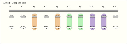 - On KH0157, the sum of the values of the first pendant in each group equals the sum of the values of the second pendant in each group. That is: