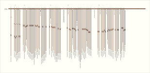| Notes: | Ashok's Notes: KH0263 is discussed extensively in Chapter 3 of Gary Urton's book Inka History in Knots: Reading Khipu as Primary Sources.Much of what follows in these notes is derived from this primary source! KH0263 is one of six khipus that are tied together, in sequence, starting with KH0293, KH0259, KH0260, KH064, then KH0263, then finally KH0262. These village khipus come from the Atarco region, in the the famous south-coast Peruvian location of the Nazca valley. Urton believes these are census data, and KH0259 and KH0264 being "almost certainly" census khipus. The khipu is organized into three sections: (Group 1) = cord p1, (Group 2) = cords p2–p4, and (Group 3) = cords p5–p74. Cord p1 is the sum of p2-p4 including subsidiaries. Cord p5-p74 are grouped into various five-cord sets. Cluster 3,6, and 8 have 20 cords - 4 color-banded sets of 5 cords, alternating between MB (Moderate-Brown) and AB (Light-Brown). Cluster 4 is similar, with 2 alternate colored, color-banded, sets of 5 cords. AB sets are described by Urton as "odd" set, and MB sets as "even". The sums of of odd sets and of even sets group to 104. "Odd" AB five-cord set sums match p2, p3, and p4 while Even"" MB five cord sets match the subsidiaries p2s1, p3s1, and p4s1, although there is an error match for p4, which comes out as 14, instead of a matching value of 12. These "off-by-one" errors are not unusual. Urton proposes that the MB/dark cords represent a moiety or ayllu affiliation that is "hurin" (Quechua:lower) to that of the "hanan" (Quechua:upper) ayllu clan. Hence the sum being represented as a "subsidiary" cord. |