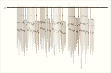 | Notes: | Khipu is divided into two "groups" of 38 and 19 pendants each. There is a .75 inch space between the two groups. Only the two tan hues use subsidiaries and the subsidiaries are always ordered lightest to darkest cord from top to bottom. 5 subsidiary cords are attached in the recto when situated to the right of its pendant (4 in Group 1, 1 in Group 2). Distinct order of color/patterns repeated 6 times through the khipu: 1 light brown, 5 light or dark tan (with staining), 1 or 2 mottled, 2 light or dark tans There are 9 mottled cords, but no mottle combos are repeated between the two groups. There are exactly twice as many pendants in Group 1, yet Group 2 has a higher knot value. The values are all skewed because cords seem to be Subsidiaries can never show more than a value of 99 on knots because they maintain the established register order of the pendants. In one group of 5 monochrome dark tan pendants, the last has a dark brown subsidiary -- did the others originally have them too? |