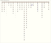 1. Khipu was wrapped tightly in spiral fashion. Primary cord wrapped around bundle several times, fastened by slipping end of pcord through last wrap. Reading done on side of khipu that would face interior of spiral, starting from the end of the pcord which would be at the center of the spiral. 2. Near end of primary cord, colors taper off and cord becomes thinner. 3. Pendants 52, 90, 96, 108 may be markers. Their attachment is not the usual half-hitch attachment. 4. The dark brown color is disintegrating in many places and makes some cords very fragile. 5. all the knots are at a consistent level. 6. Urton thinks that some of the LG color may be camelid. Brezine is unconvinced. |