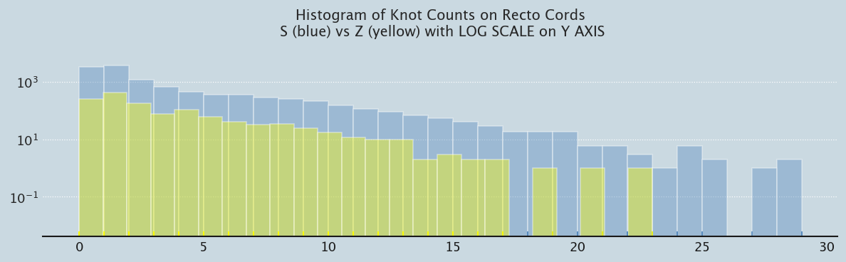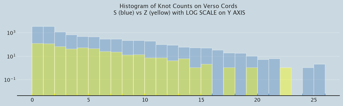 Urton suggests that perhaps the Z twist cords might be narrative in nature. I’m curious what the number of knots distributed over Z cords looks like: vs S cords