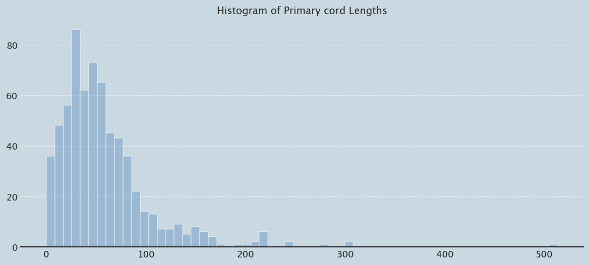 prep_plot()sns.distplot(pcord_df.pcord_length.values, bins=60, color="#588bbe", kde=False, rug=False).set_title('Histogram of Primary cord Lengths');