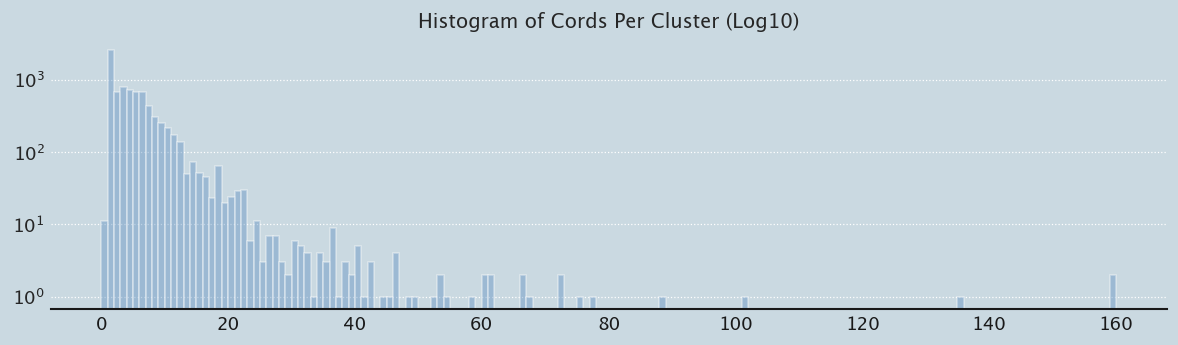 prep_plot(3)sns.distplot(cluster_summary_df.cords_per_cluster.values, bins=160, color="#588bbe", kde=False, rug=False, hist_kws={'log':True}).set_title('Histogram of Cords Per Cluster (Log10)');