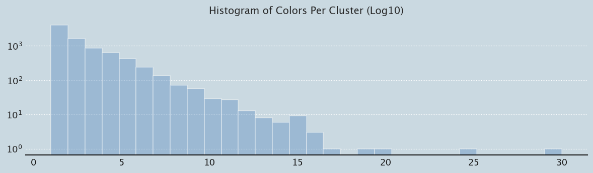 cords_per_cluster =list(cluster_summary_df['cords_per_cluster'])cord_cluster_counter = Counter(cords_per_cluster)cord_count =sorted(cord_cluster_counter.most_common(), key=lambda x: x[0])colors_per_cluster =list(cluster_summary_df['colors_per_cluster'])color_cluster_counter = Counter(colors_per_cluster)color_count =sorted(color_cluster_counter.most_common(), key=lambda x: x[0])max([num_colors for num_colors, occurences in color_count])