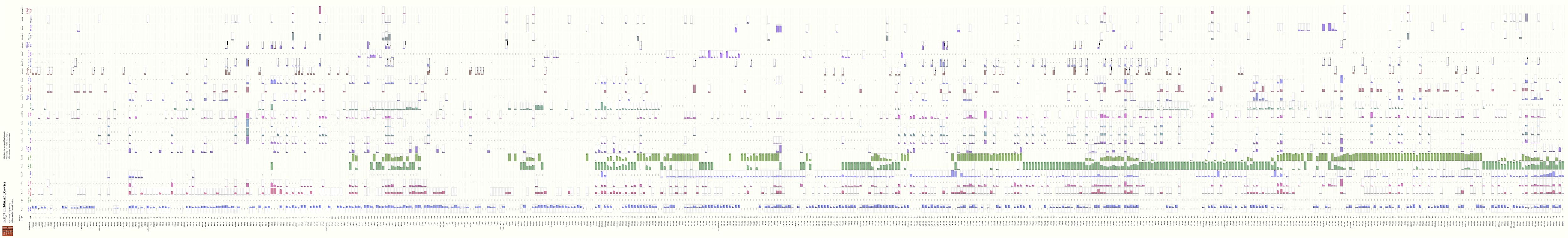 The Khipu Fieldmark Browser shows the fieldmarks for every khipu in the Khipu Field Guide. Khipus with a significant value for that fieldmark are shown with a box that describes the relative size value of that khipu. Khipus are row sorted (as the default order) by similarity to each other, and the columns are sorted by similarity to each other - for example the Number of Ascher Colors is likely to be correlated with the Number of Cords, and indeed, the sorting hat places the columns close to each other. Some fieldmark values such as decreasing cord value clusters show a Handedness, appearing significantly on the left or right of the khipu. These khipus have fieldmarks with a lower bar showing the degree of handedness - indicated by a black/red thermometer.