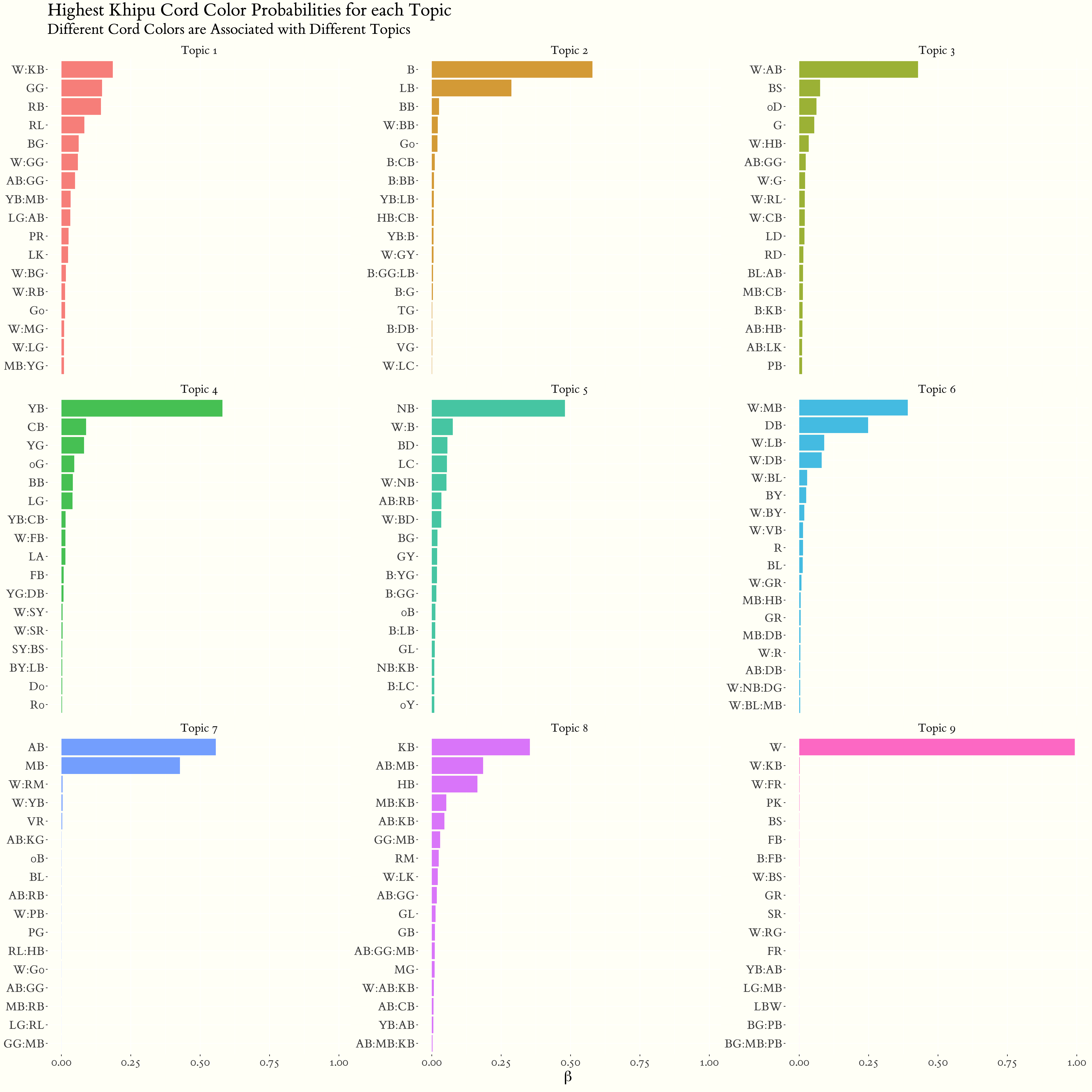 These are the 9 most common topics made of “word sets”, or as we call them, Cord Colors. A given khipu, then might contain 20% of Topic 4 (mostly YB cords), and 40% Topic 9 (W Cords), etc. Another sample inference; if it contains a lot of Topic 7, there’s a good chance it will have both AB and MB cords in it.