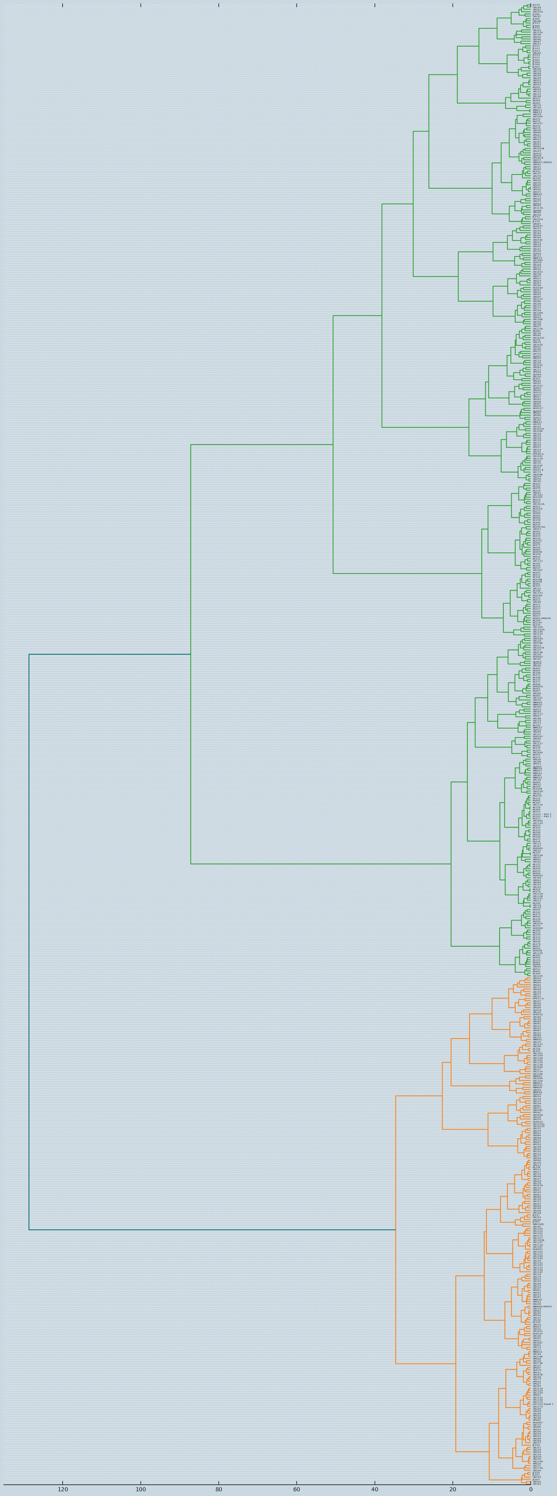 # Initialize plotlyplotly.offline.init_notebook_mode(connected =False);fig, ax = plt.subplots(figsize=(15, 40)) # set sizeax = dendrogram(Z, orientation="left", labels=khipu_names);plt.tick_params(\ axis='x', # changes apply to the x-axis which='both', # both major and minor ticks are affected bottom='off', # ticks along the bottom edge are off top='off', # ticks along the top edge are off labelbottom='off')plt.tight_layout() #show plot with tight layout#uncomment below to save figureplt.savefig('./images/khipu_clusters.png', dpi=200) #save figure as ward_clusters# Clustered sorted_by_similarity = ax['ivl']#print(sorted_by_similarity)