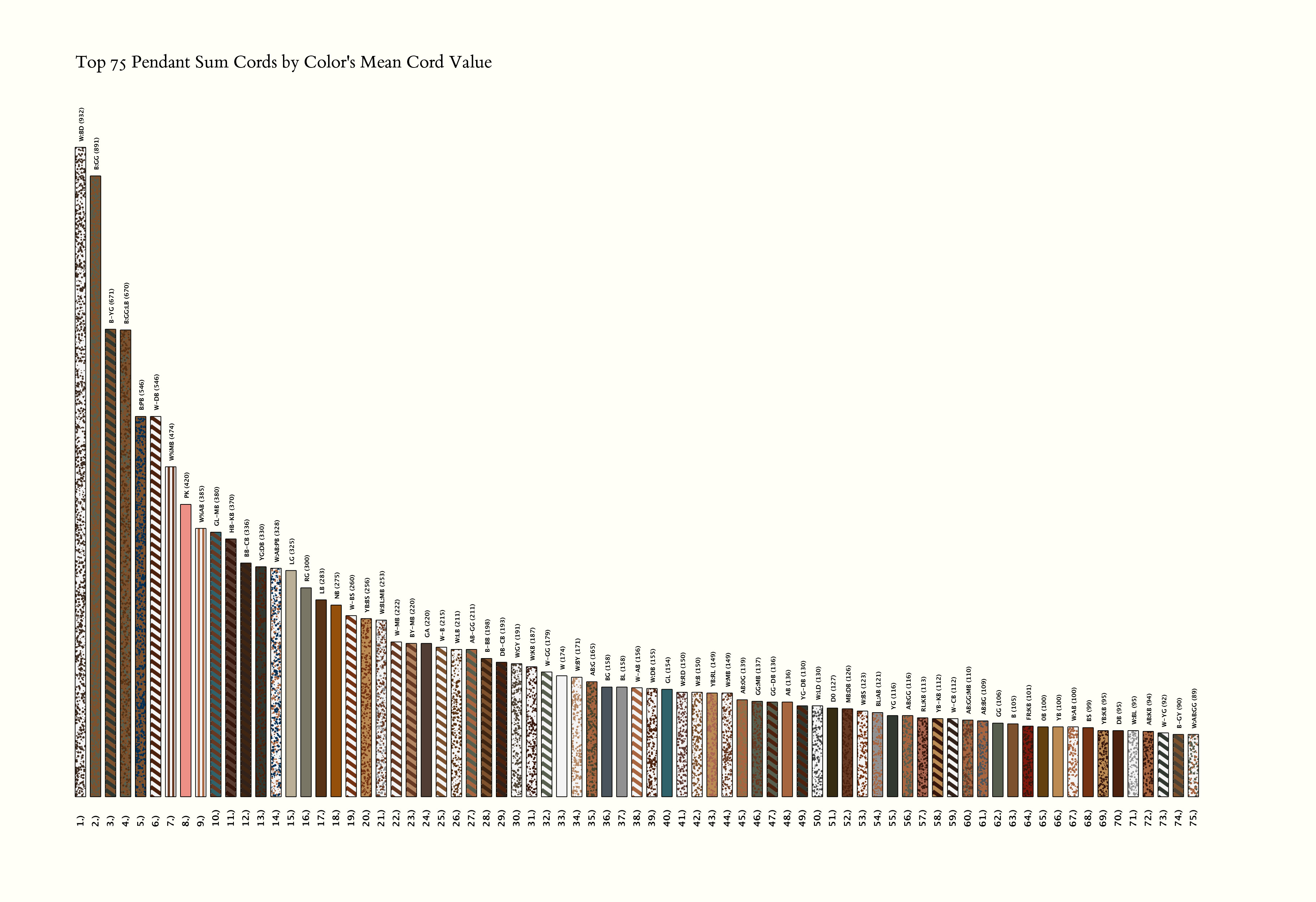 These two charts tell us that while White is the predominant pendant sum color, it comprises less than 27% of the pendant sum colors. About the same as its overall occurrence as a cord in the Khipu Field Guide.