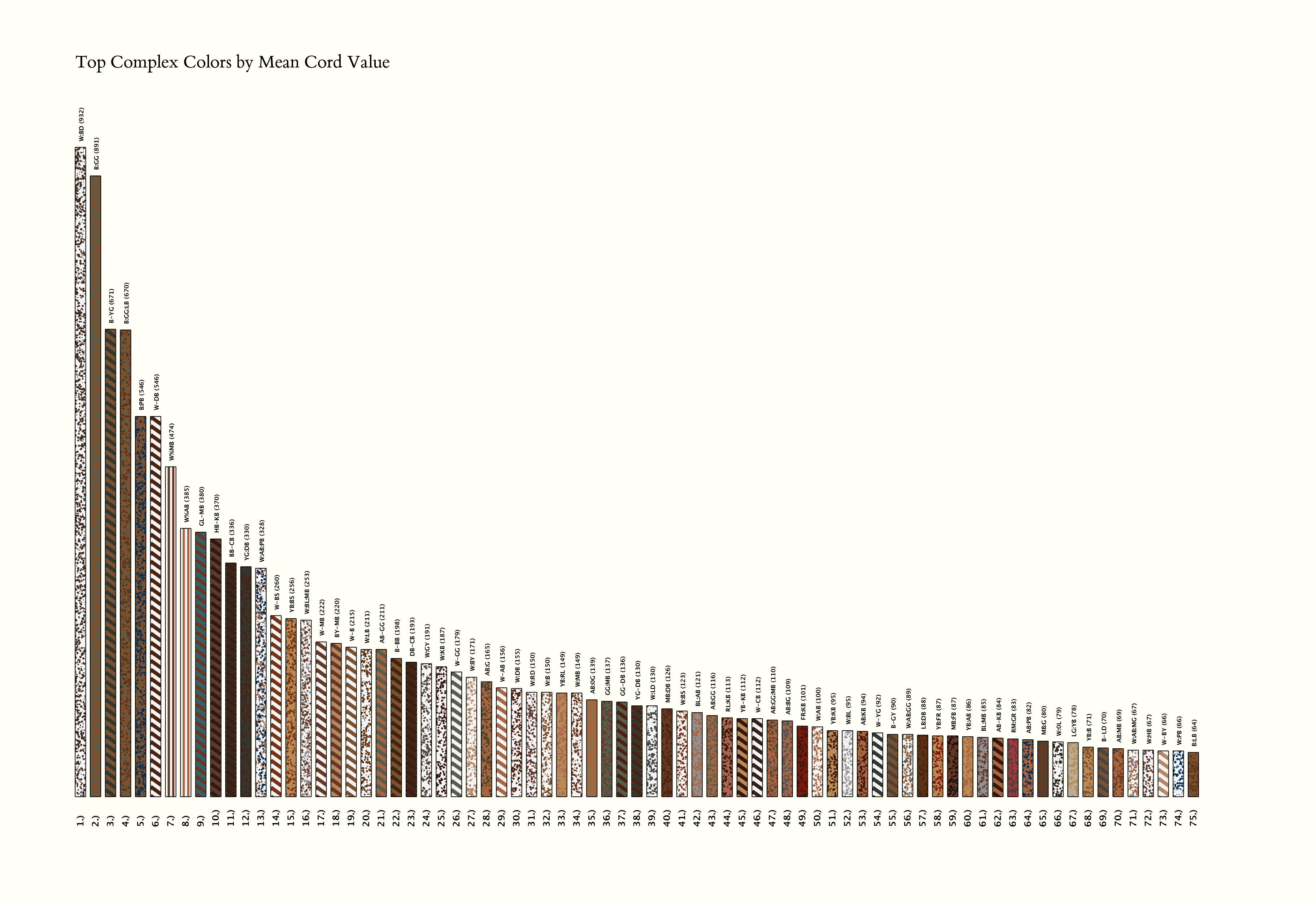 from collections import OrderedDict, Counterimport utils_loom as uloomdef build_pendant_color_frequencies(): ascher_colors = []for aKhipu in all_khipus: khipu_cords = aKhipu.pendant_cords()for cord_index, aCord inenumerate(khipu_cords): cord_colors = [aColor.full_color for aColor in aCord.ascher_colors]iflen(cord_colors)>0: ascher_colors += cord_colorsreturn OrderedDict(Counter(ascher_colors).most_common()) pendant_color_frequency_dict = build_pendant_color_frequencies()pendant_sum_color_frequency_dict = OrderedDict(zip(color_frequency_df.ascher_color.values, color_frequency_df.num_occurrences.values))theta = uloom.degrees_between_dicts(pendant_color_frequency_dict, pendant_sum_color_frequency_dict)print(f"Angle between all_colors vector and pendant color vector is {theta:0.2f}° degrees")