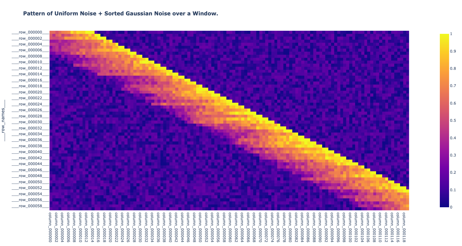 fig = (px.imshow(funky_array_df, width=1500, height=800, title="<b>Pattern of Uniform Noise + Sorted Gaussian Noise over a Window.</b>")) #.show())