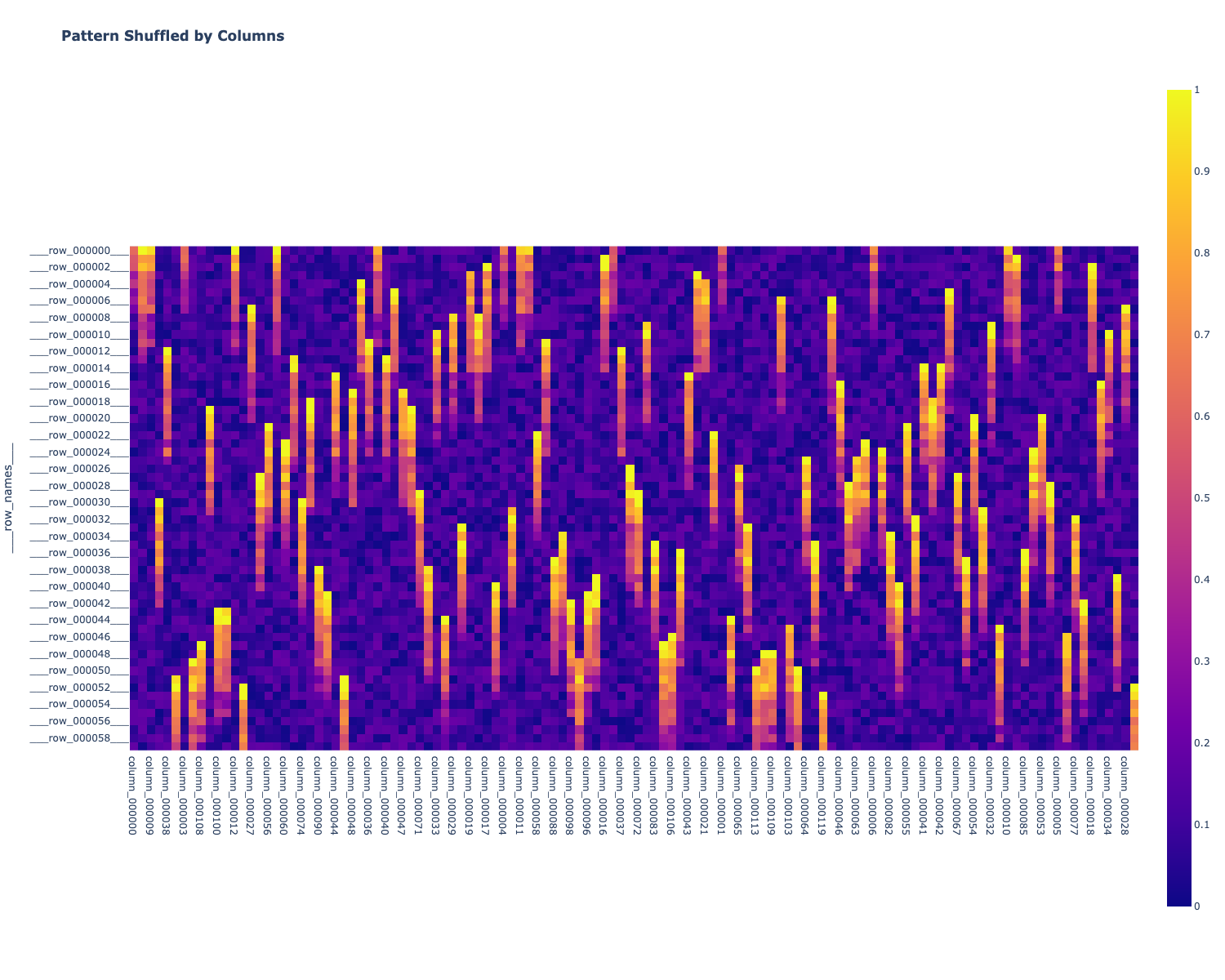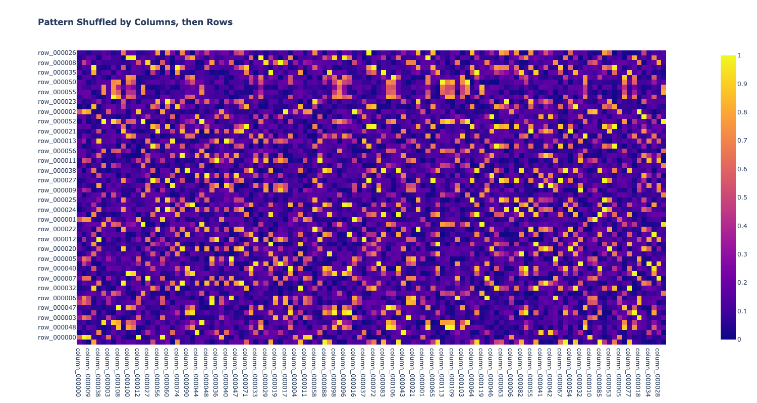 fig = (px.imshow(funky_row_shuffled_df, width=1500, height=800, title="<b>Pattern Shuffled by Columns, then Rows</b>"))#.show())