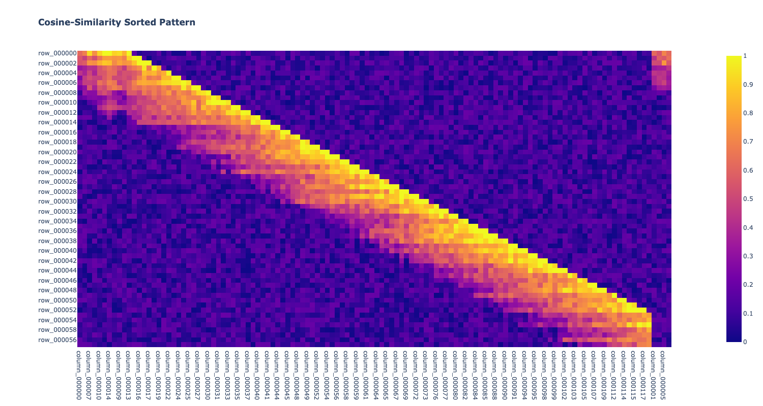 The algorithm basically compares distances between two vectors by the cosine of the angle between them. From that we can create a sorting algorithm where vectors are matched with their closest neighbor. By sorting on columns, and then rows, the entire matrix can be sorted/clustered.