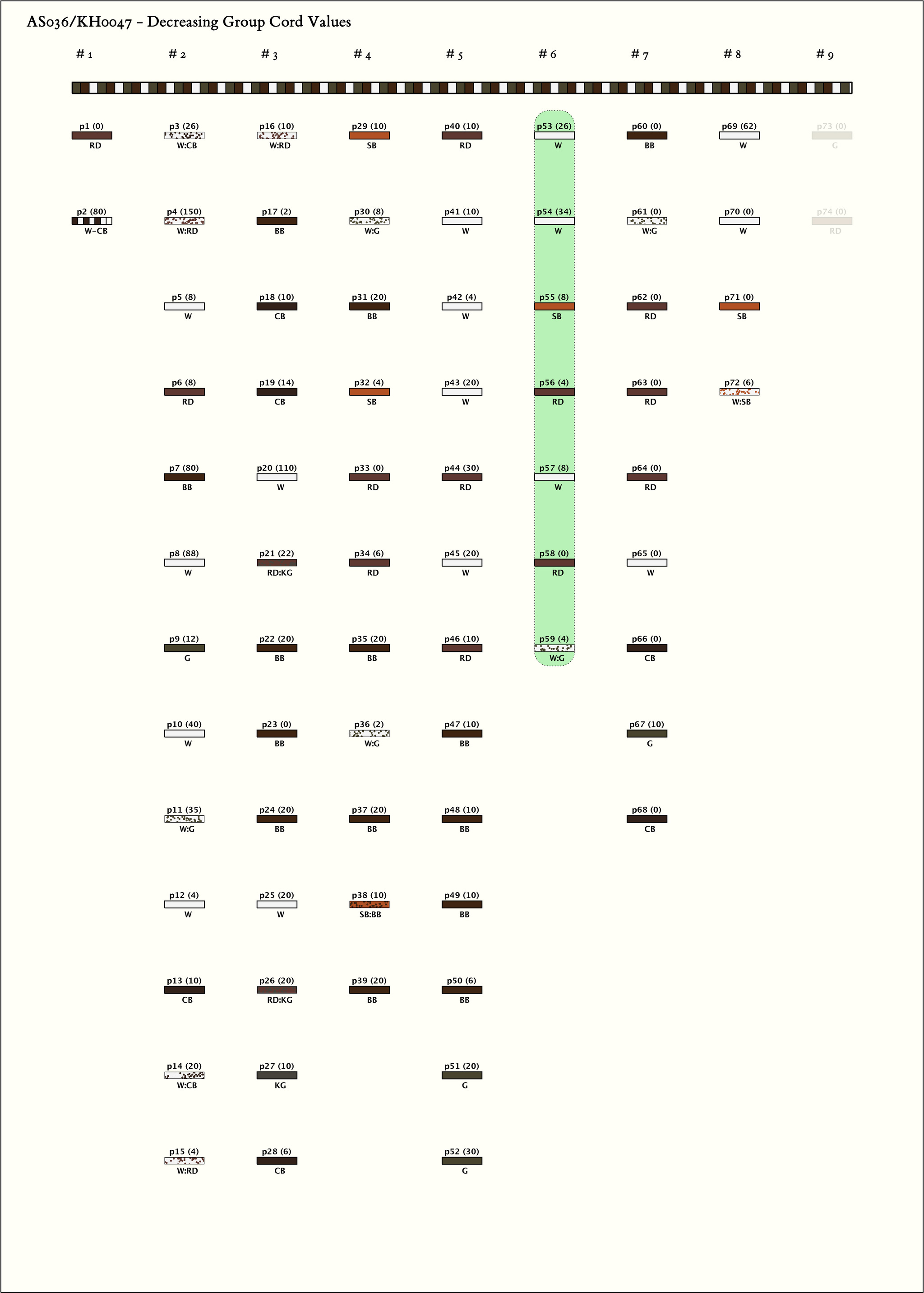 - The colors W, G, RD, SB, BB, CB, and KG appear alone or in combination on both AS036 and AS037 . AS037 uses the 2 additional colors B and LG . Neither of the khipus have been given numerical interpretation.
