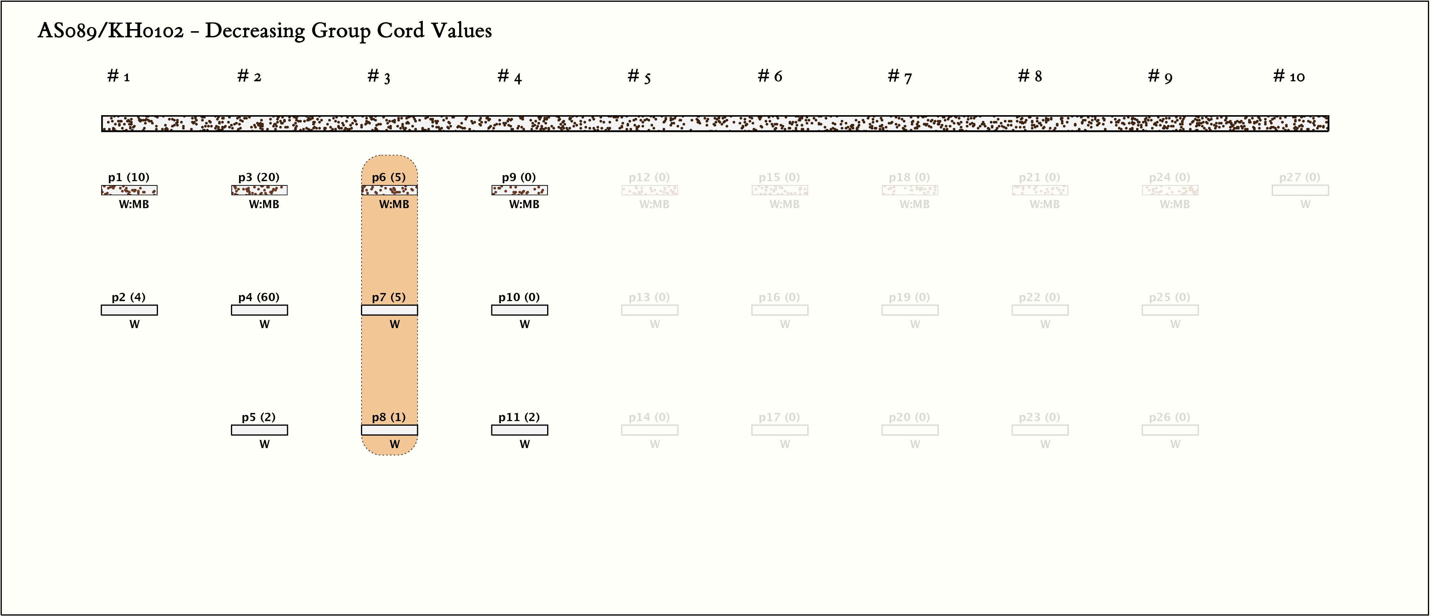 - AS087 differs markedly from the other 5 khipus. All its colors are different and it is the only one where different type knots appear in all different positions on the pendants. It is, however, similar to AS095, also donated by Gaffron.
