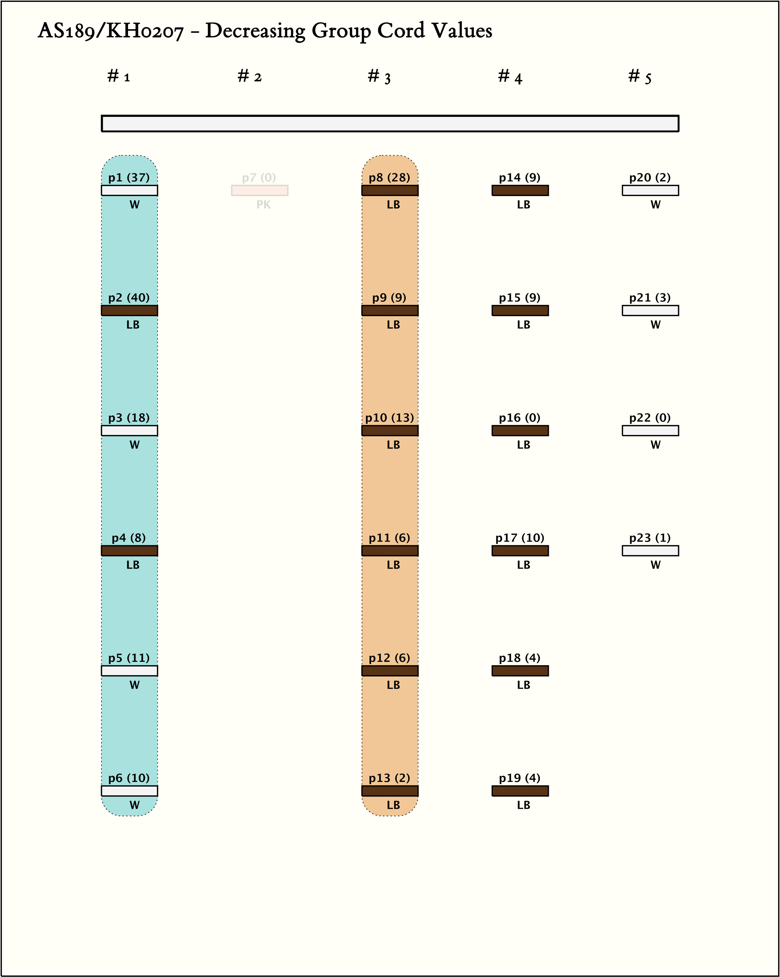 - By spacing, the khipu is separated into 4 groups. The first group is separated from the next 3 groups by a large space which included a single pendant cord. Groups 1-3 each have 6 pendants.