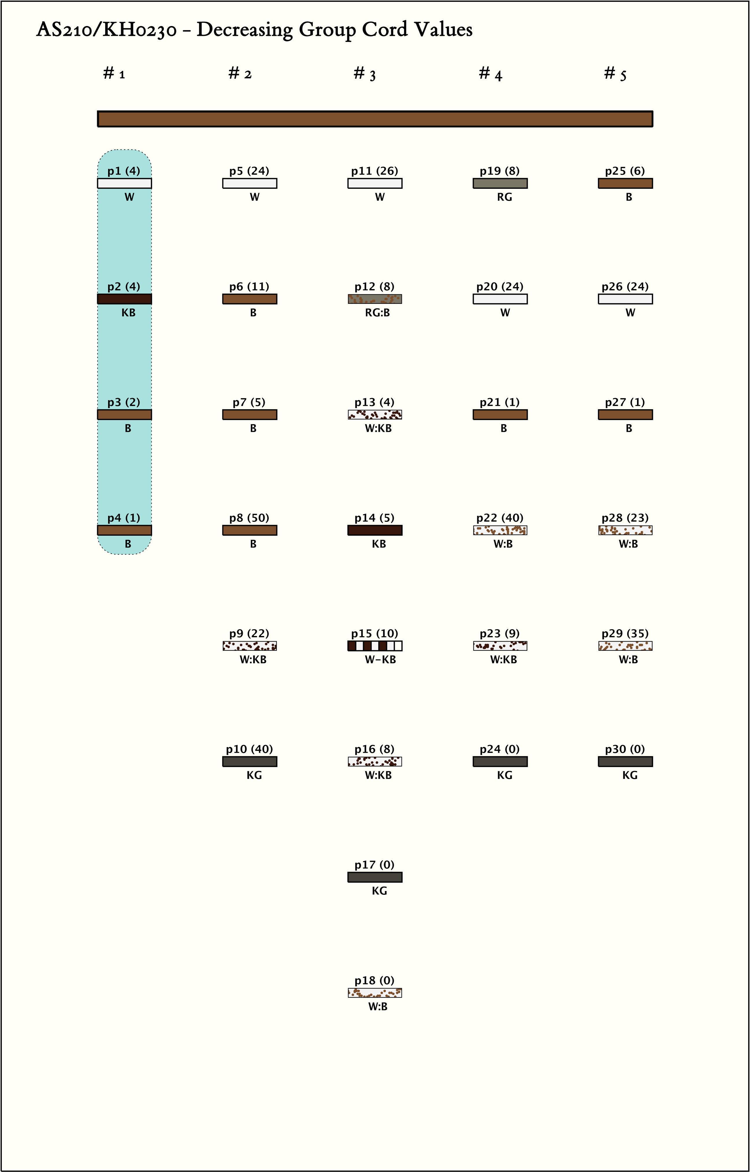 - By spacing the khipu is separated into 5 groups. By color and values the groups form 3 parts: part I is a group of 4 pendants; part II is two groups of 6 and 8 pendants respectively; and part III is two groups of 6 pendants each.