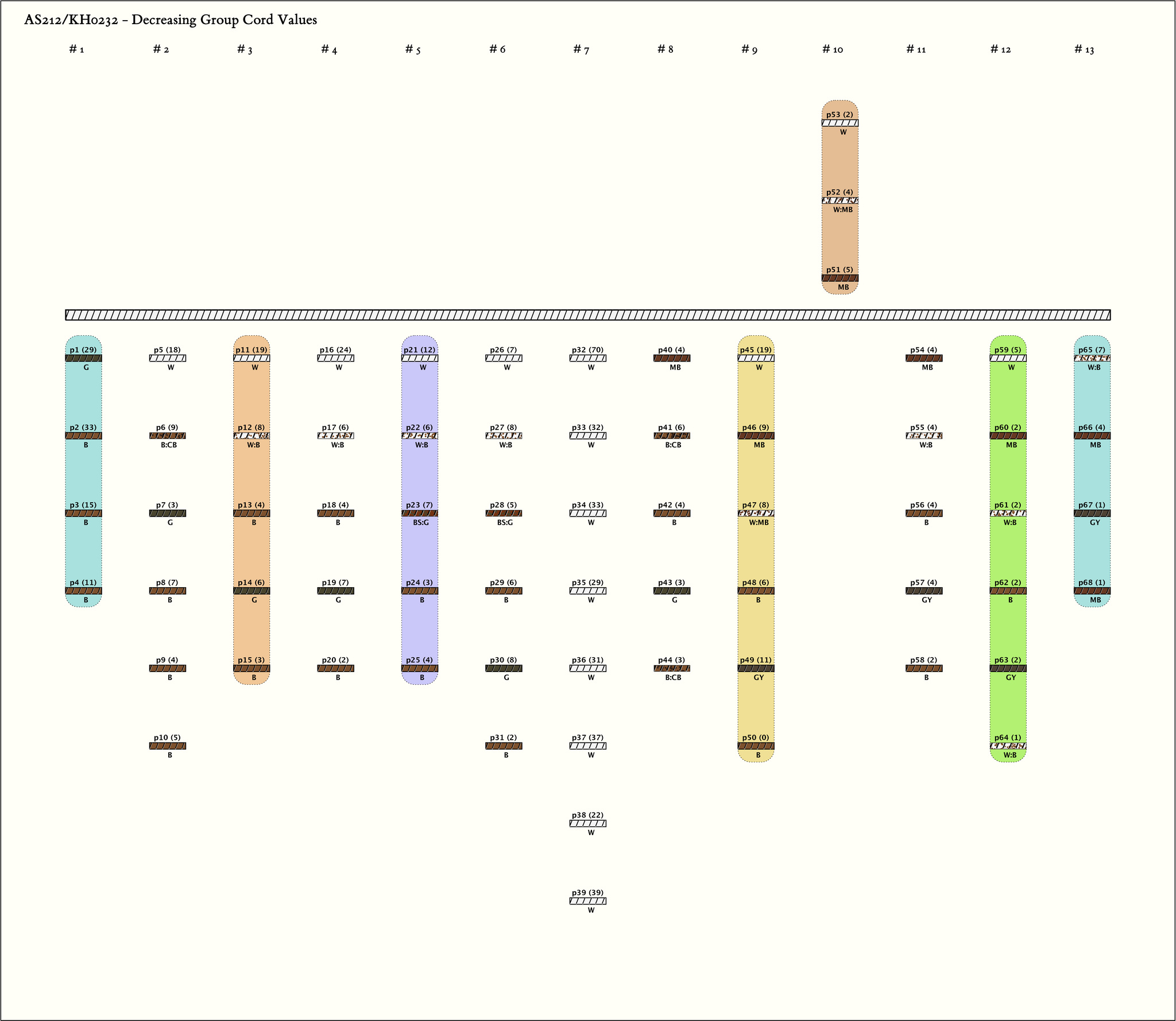 - By color, group sizes, and spaces along the main cord, the khipu resolves into five parts of 2, 4, 1, 5, 1 groups respectively. The groups each contain from 4 to 8 pendant cords. The parts, alone and in comparison, are discussed in the observations that follow.