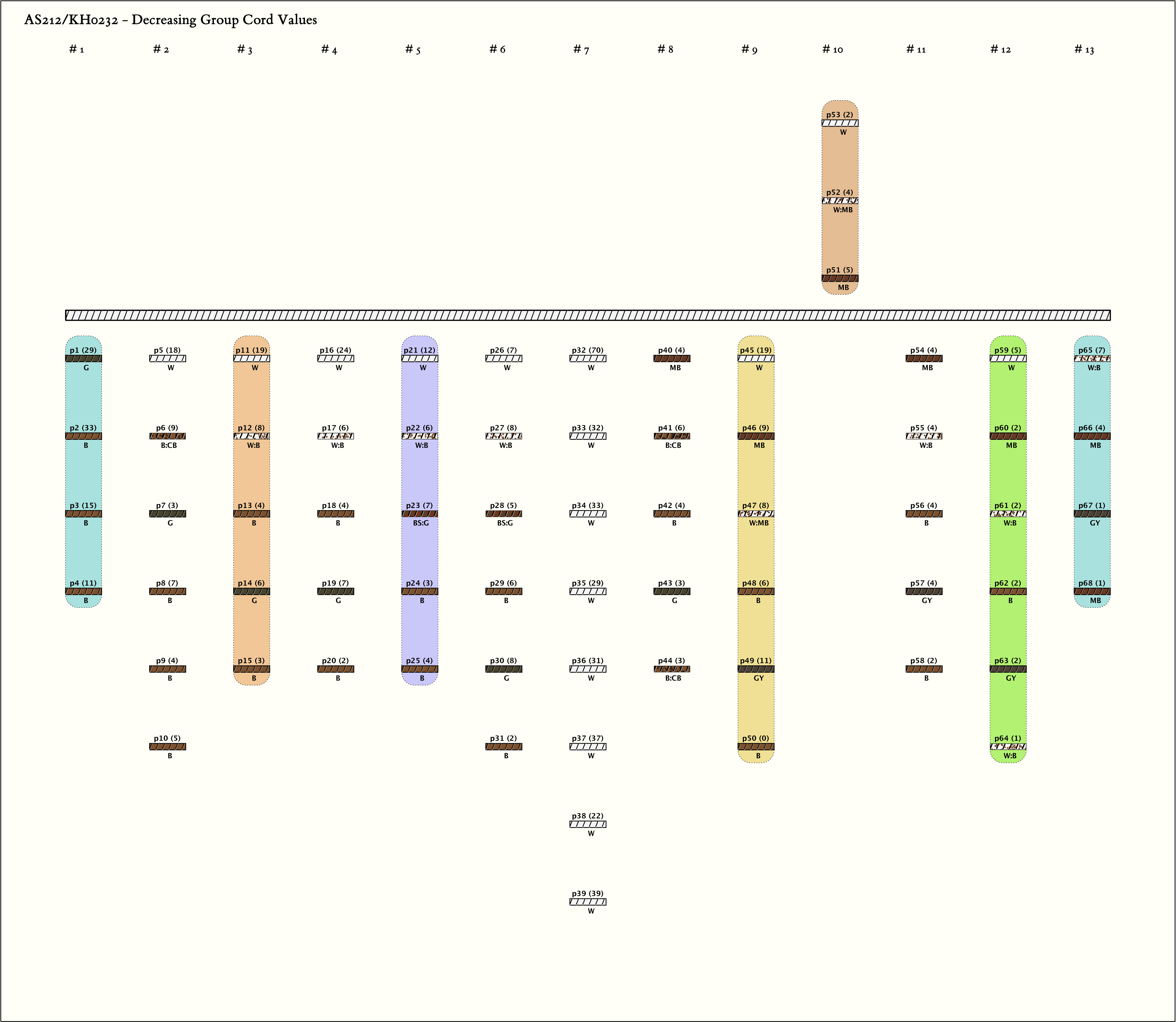 - Construction Note: Two cords of 30 cm. and 19 cm. are knotted together and knotted to the main cord within this space. Both cords appear to have been cut. The cords are undyed (W) but have marks of being unravelled from some mottled combination. The cord attachments do not appear to be part of the original khipu construction and there is nowhere on the khipu they seem to have come from.