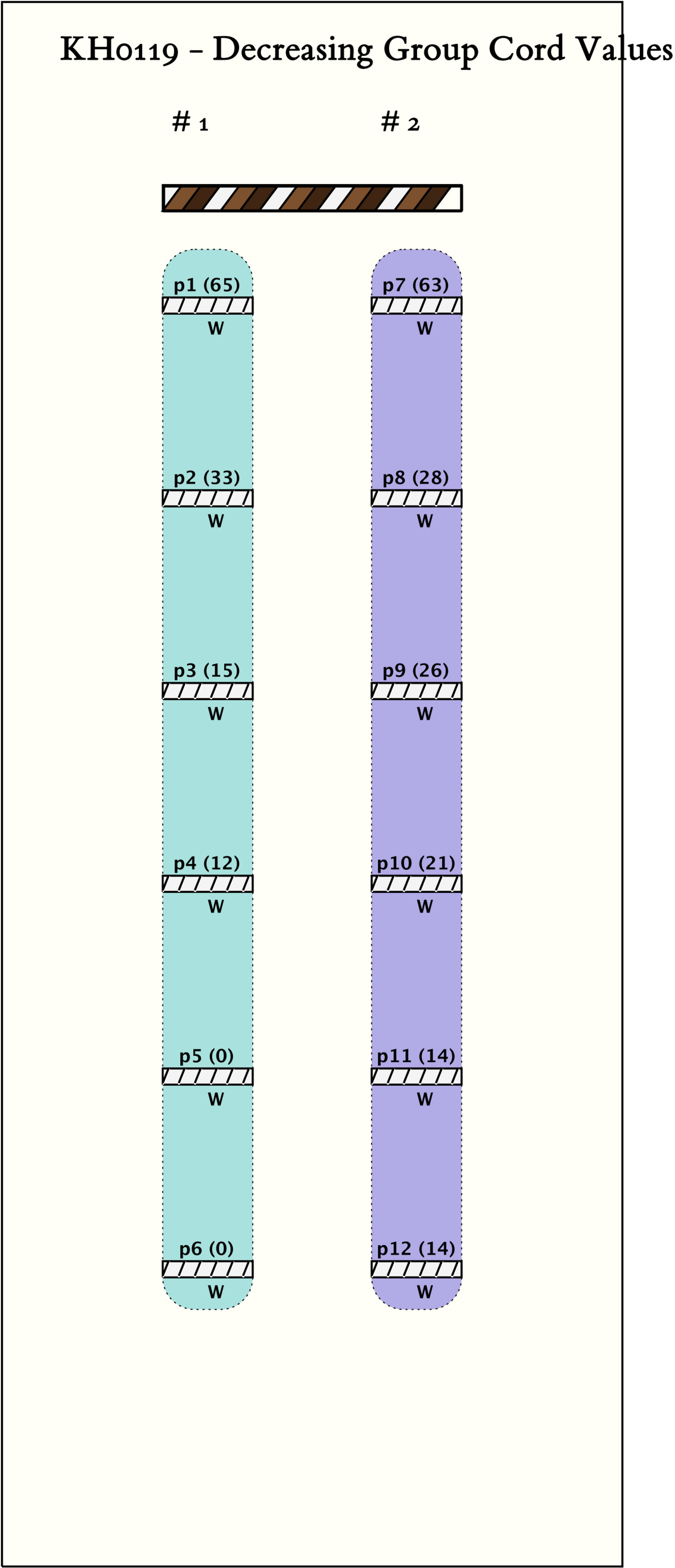 - By spacing, the khipu is separated into 2 groups of 6 pendants each. All the pendants are color W. Where there is one subsidiary on a pendant, it is color R0 or B; where there are 2 subsidiaries, they are one of each color.