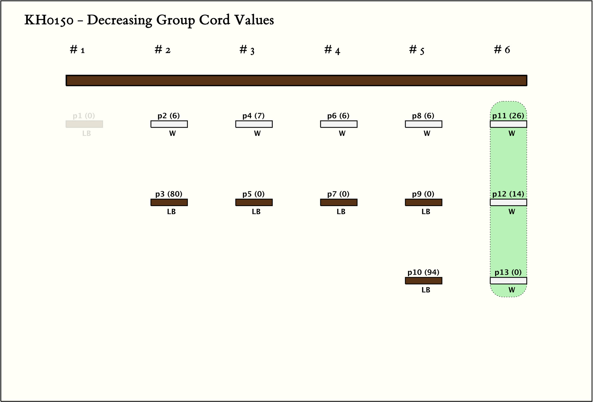 - By spacing, the khipu is separated into 3 groups of 2 pendants each and then 2 groups of 3 pendants each. In each group of 2 pendants, the color order is LB, W.