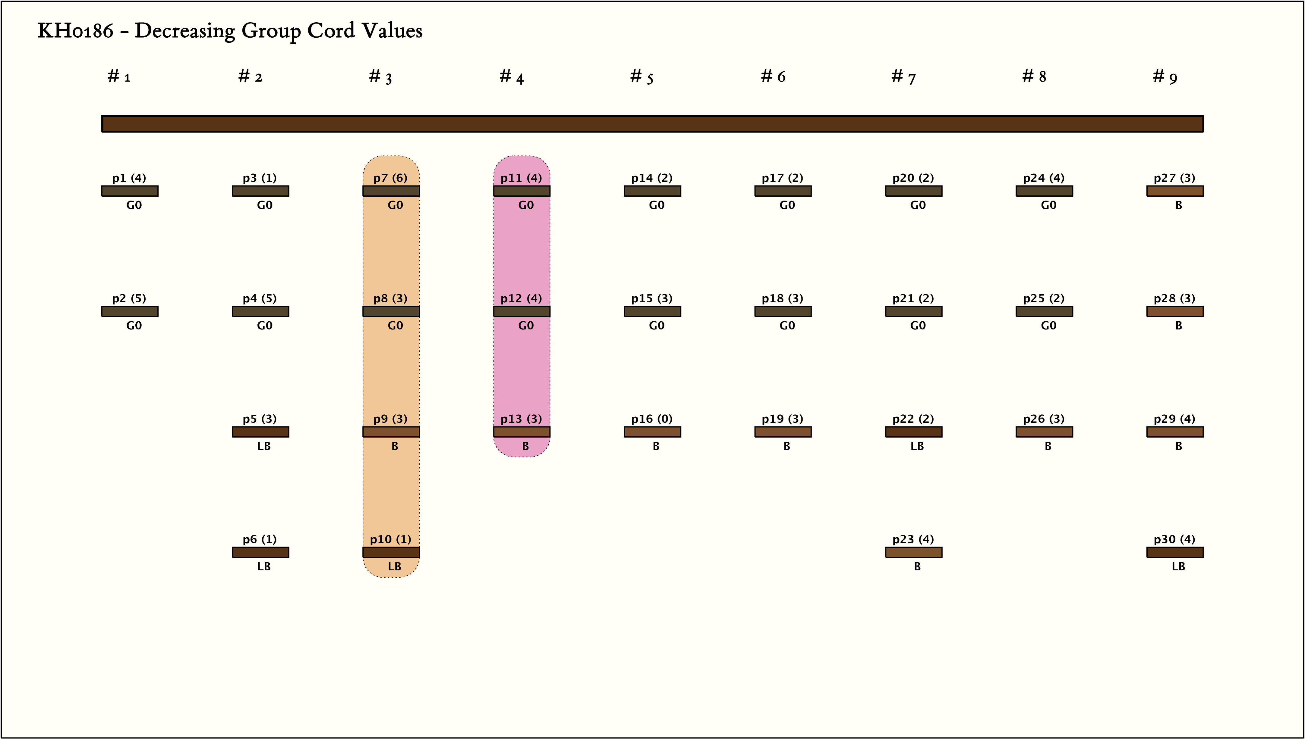 - By spacing, the khipu is separated into 9 groups of 2, 3, or 4 pendants each. The first 2 pendants in each group are the same color: for groups 1-8 they are all 0G, and in group 9 they are B.