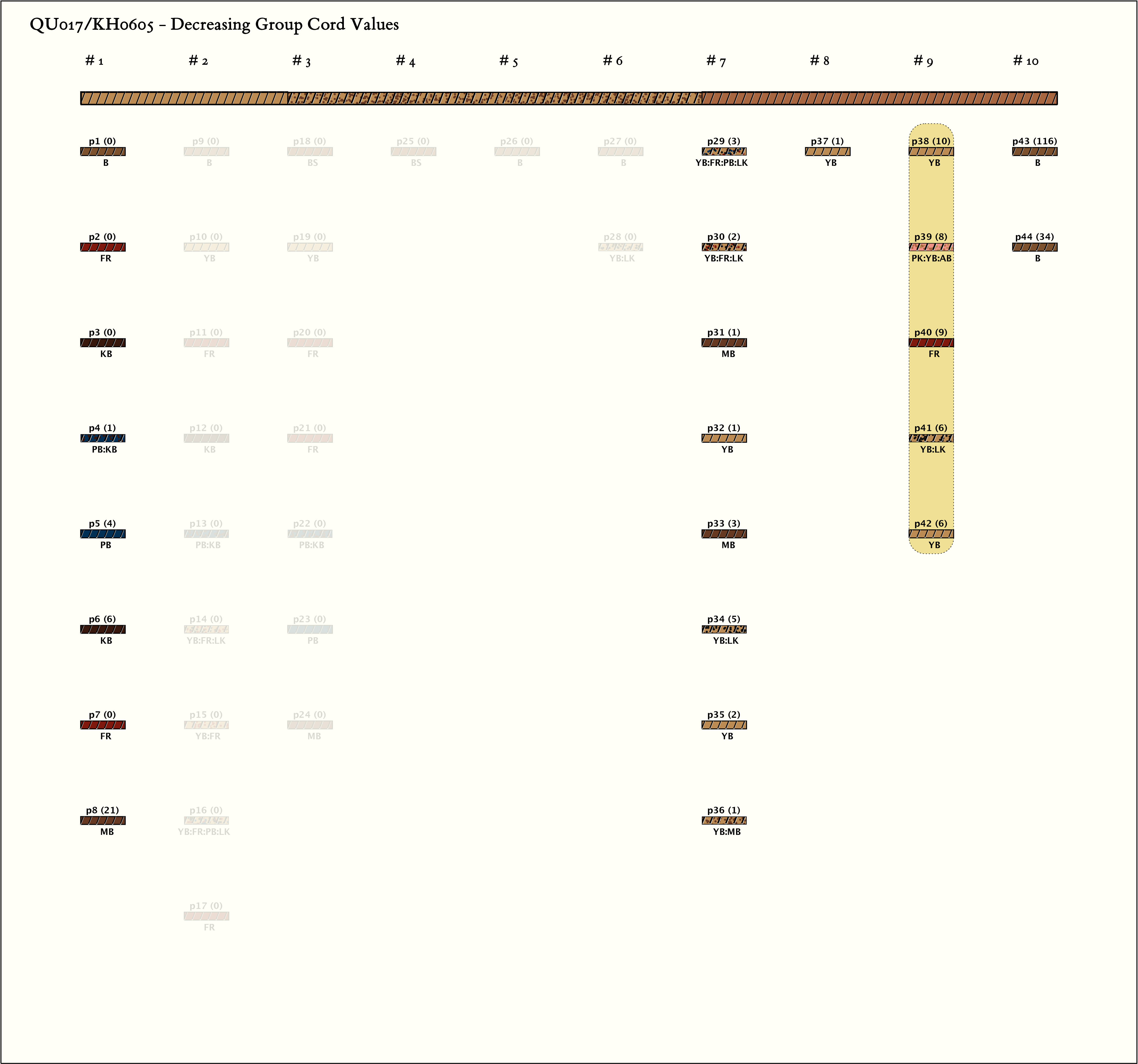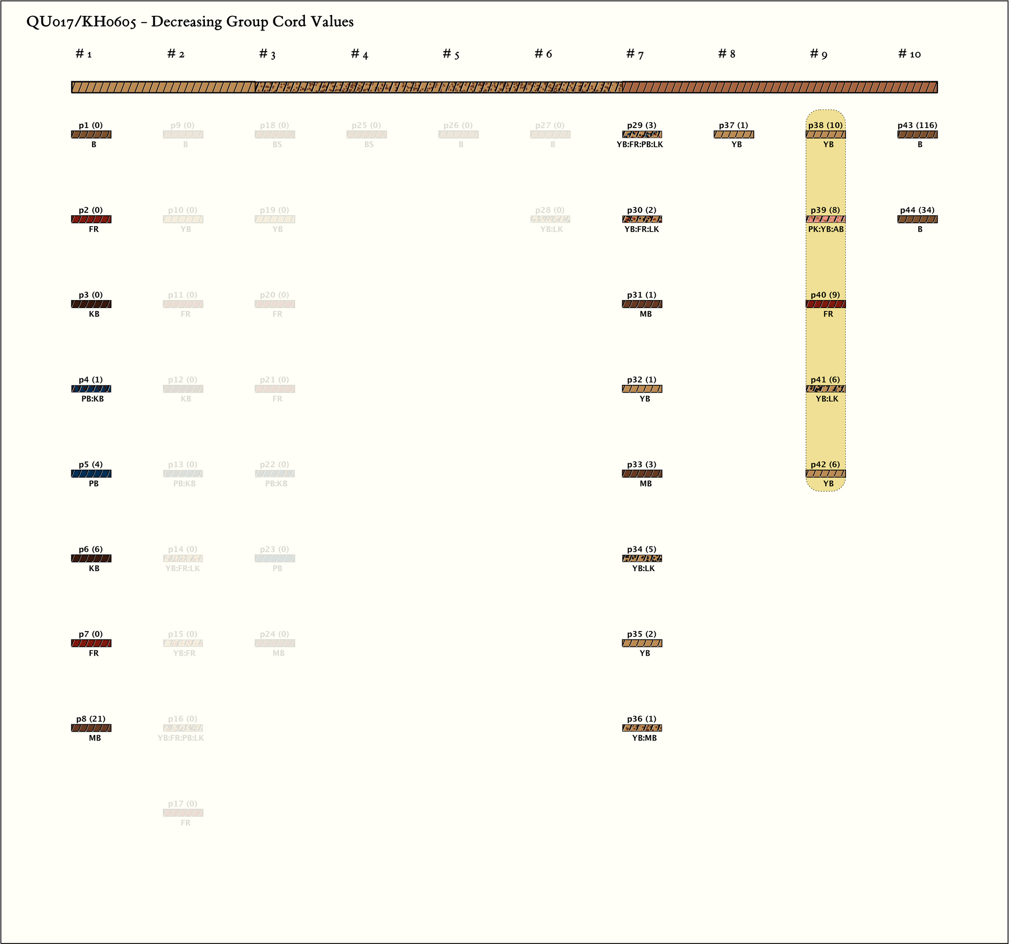 There are 3 S-plied main cords knotted together (by single overhand knots?). Main A- mon lt tn. Main B - mot md br/lt tn. Main C - mon lt br.