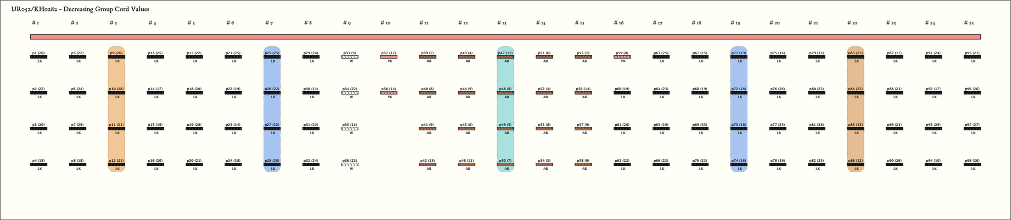 This khipu has been reconstructed using information from Jon Clindaniel's DASH thesis notes at Harvard. Cord cluster information is missing and has been defaulted to one cord per cluster.