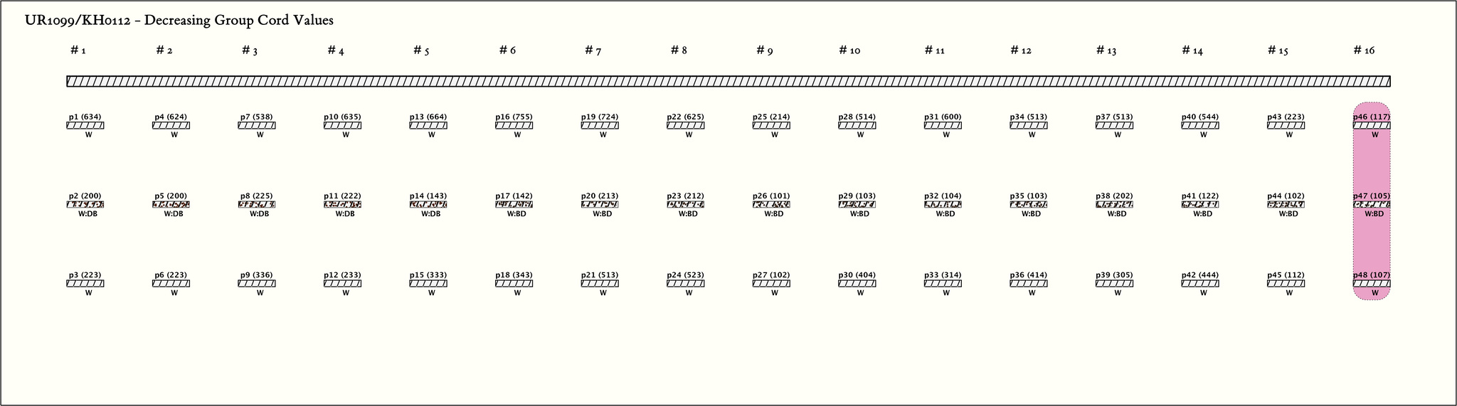 - By spacing, the khipu is separated into 16 groups of 3 pendants each. Each group has the same color pattern: W, DB:W, W. In every group, the value in position 1 is greater than the value in position 3 which is greater than (or equal to) the value in position 2.