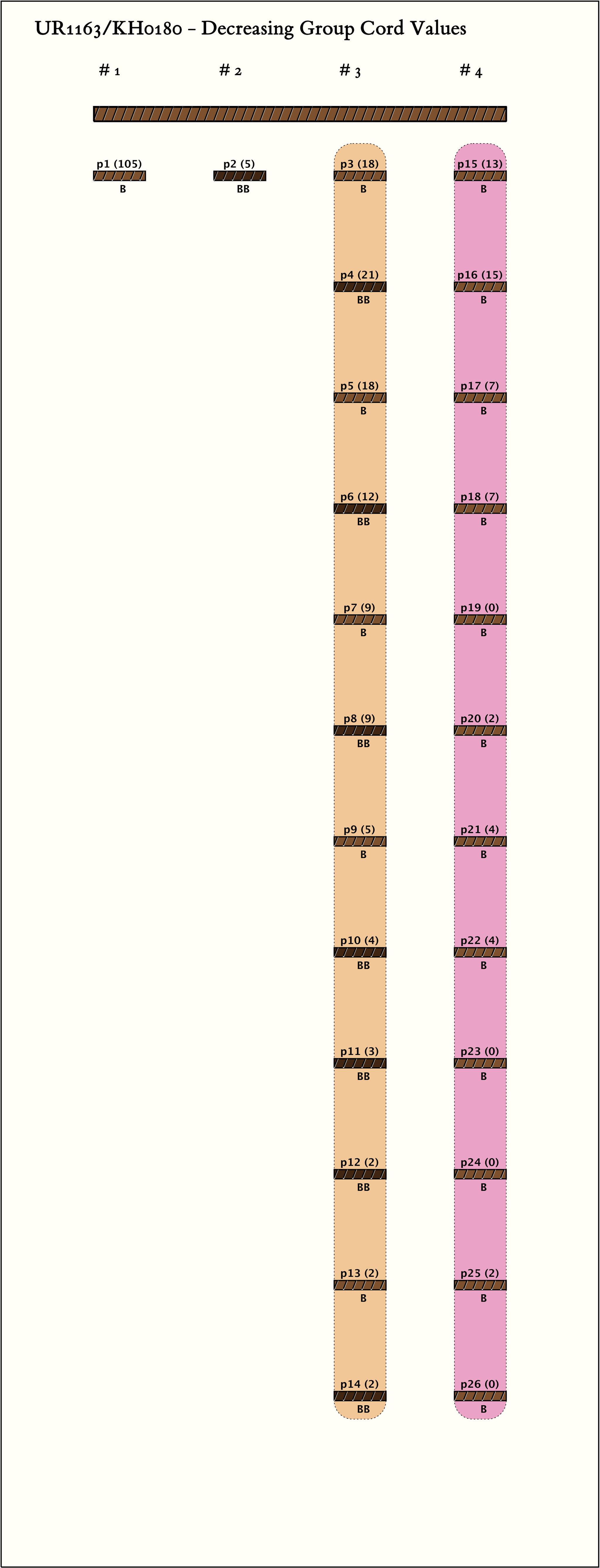 - Construction note: The twisted end of cord 1 is linked through the twisted end of the main cord so that it dangles from the end of the main cord. (See diagram for UR1100.)