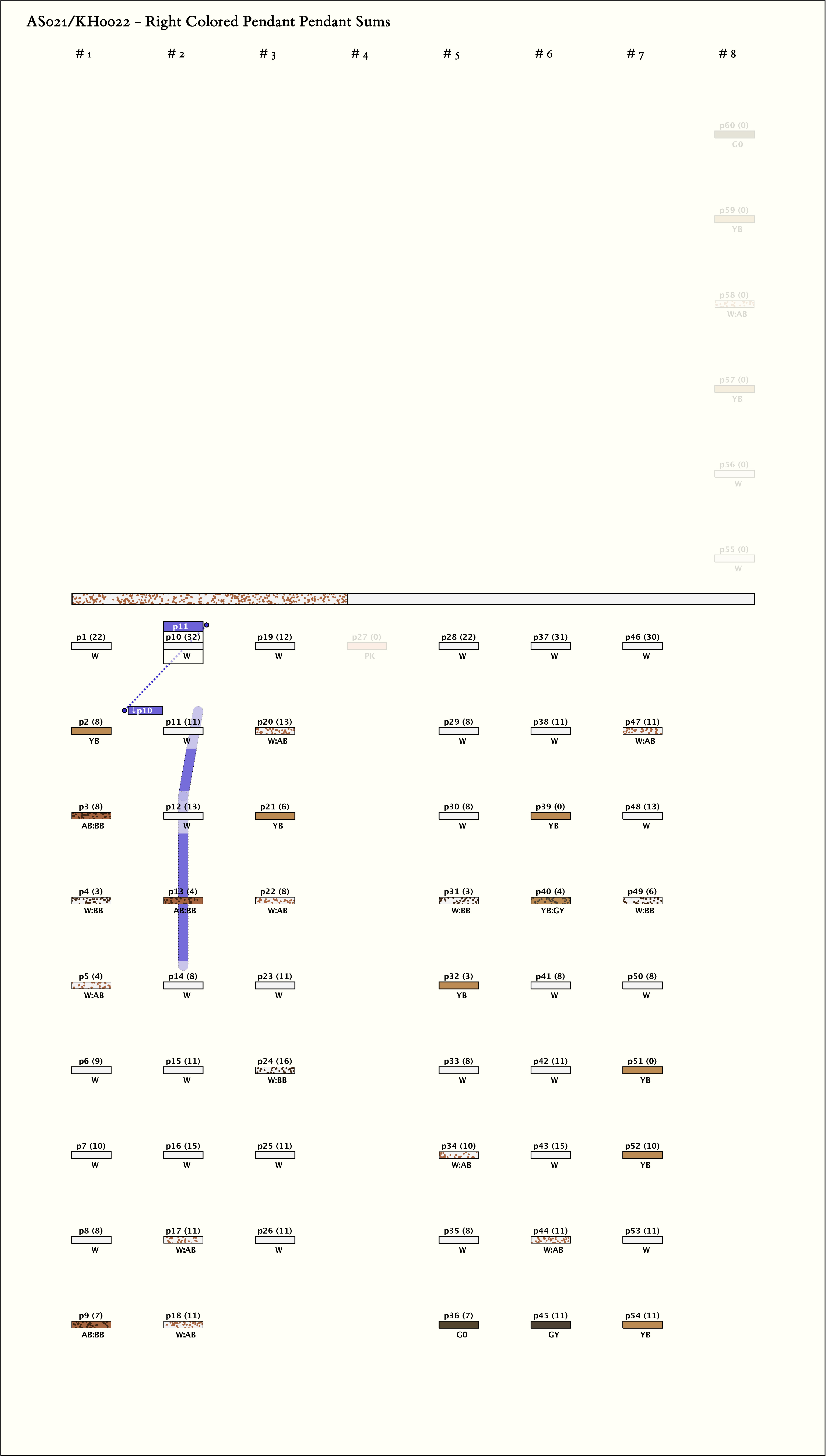 - This khipu consists of 2 main cords tied together. The main cord on each part is a different color. Part I, by spacing, contains 3 groups of 9, 9, 8 pendants and Part II, by spacing, contains 4 groups of 9, 9, 9, 6 pendants, respectively.