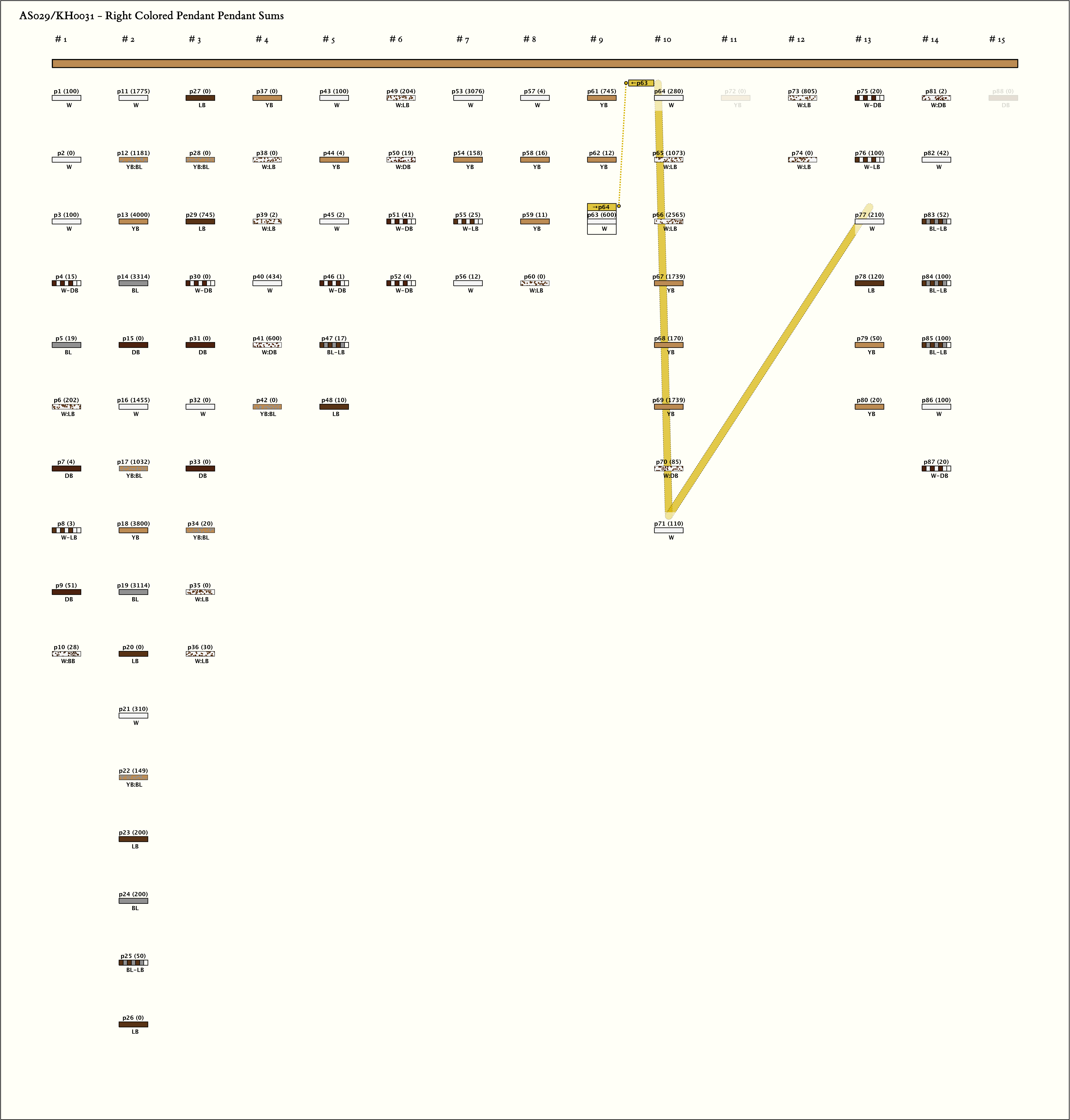 - Using 6 basic colors, 18 additional cord colors were created. DB appears alone, is twisted with W, is mottled with W, is joined with W in three different orders (DB/W, W/DB/W, DB/W/DB), is twisted with BL, and is joined with BL. The DB-BL twist is joined with W and is joined with DB, while the DB-W twist is twisted again with DB, and the mottled DB:W is joined with DB. LB appears alone, is twisted with W, is joined with W in two different orders (LB/W, W/LB), is twisted with BL and is joined with BL. YB appears alone, is mottled with W, and is mottled with BL. BL and W each appear alone as well as in the combinations described above. BB only appears alone.