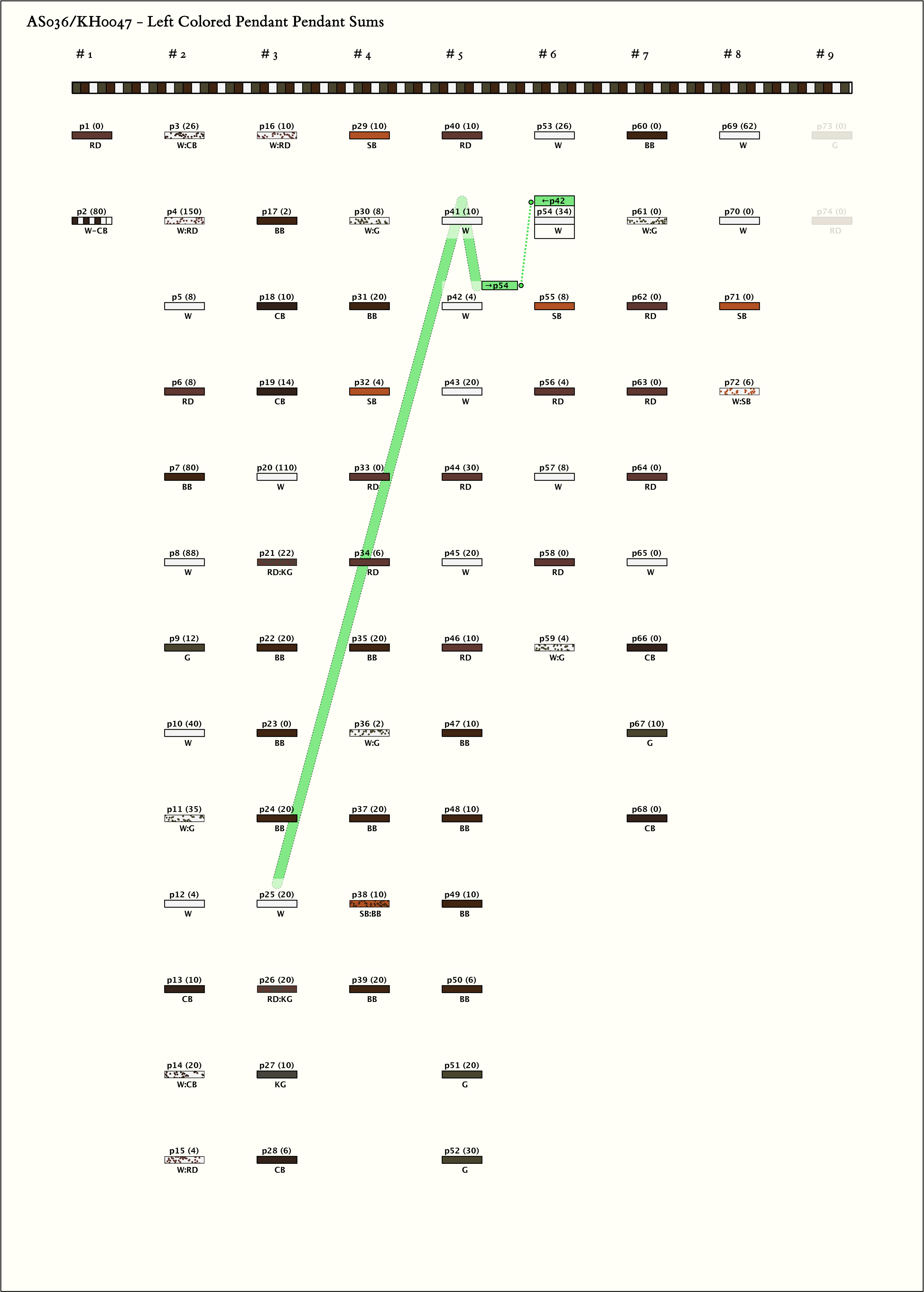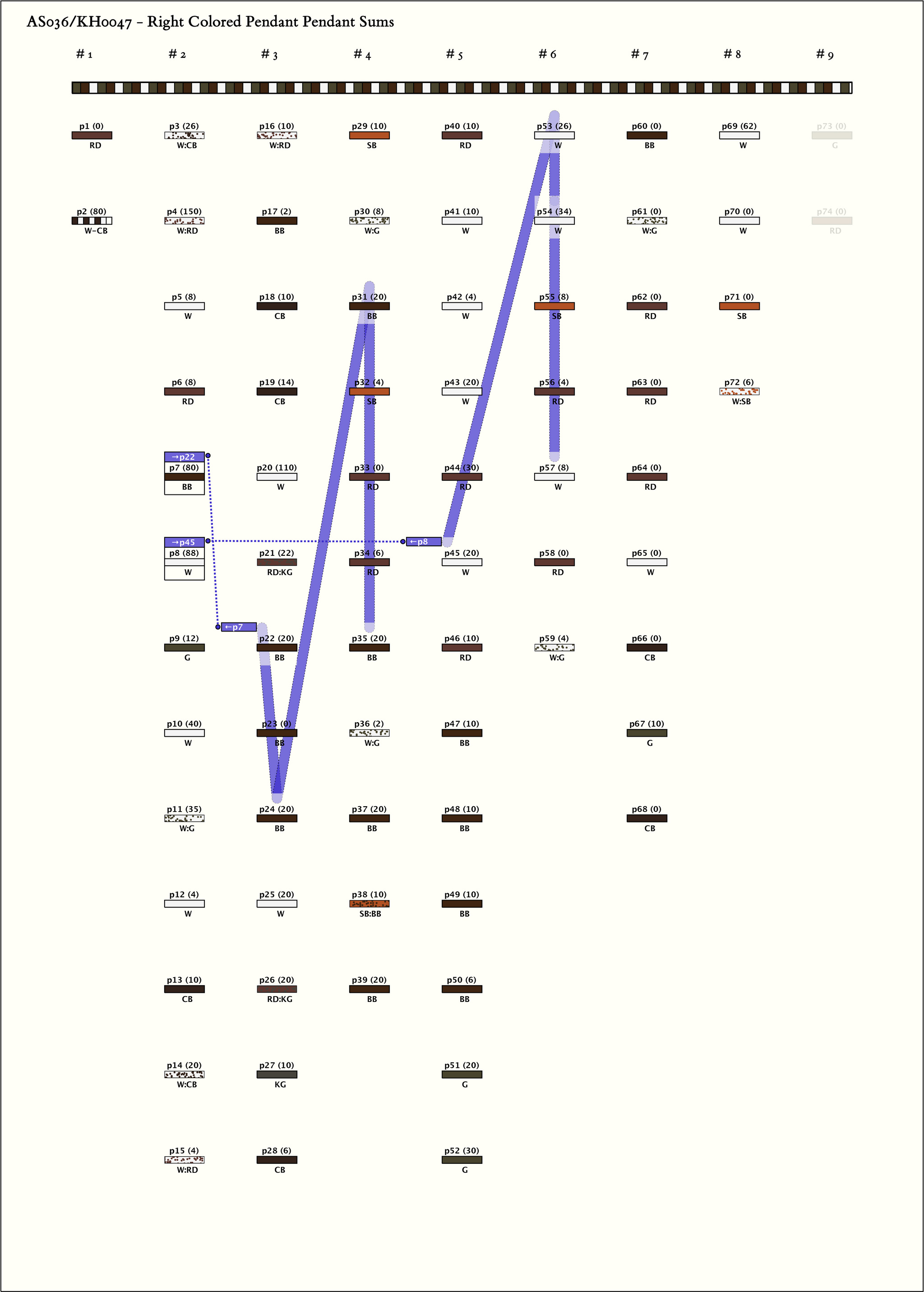 - The colors W, G, RD, SB, BB, CB, and KG appear alone or in combination on both AS036 and AS037 . AS037 uses the 2 additional colors B and LG . Neither of the khipus have been given numerical interpretation.