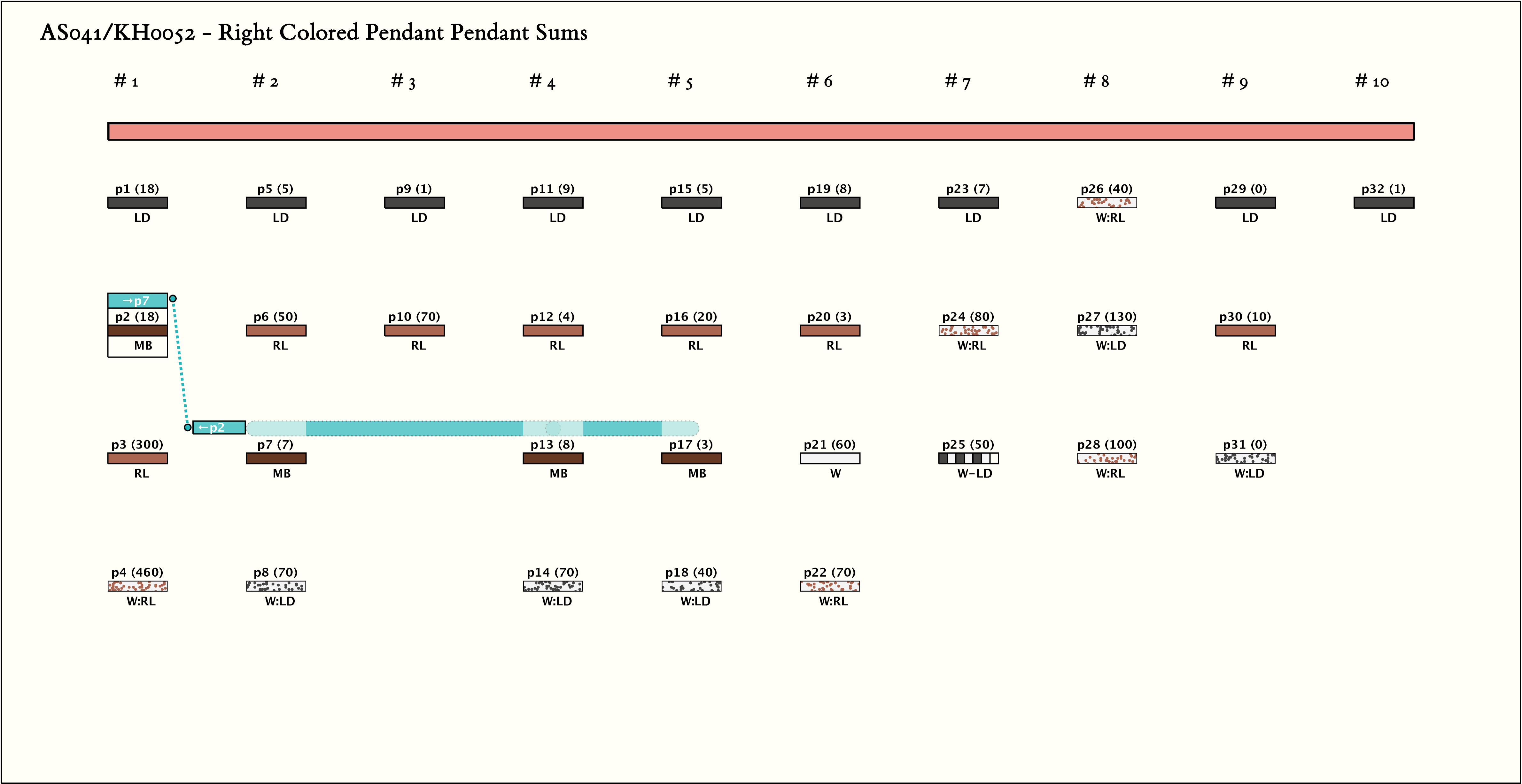 - By spacing there are 10 groups of 4, 4,2, 4, 4, 4,3, 3,3, 1 pendants. There is some consistency of color pattern. LD appears in 9 of the 10 groups in position 1 and in no other positions.