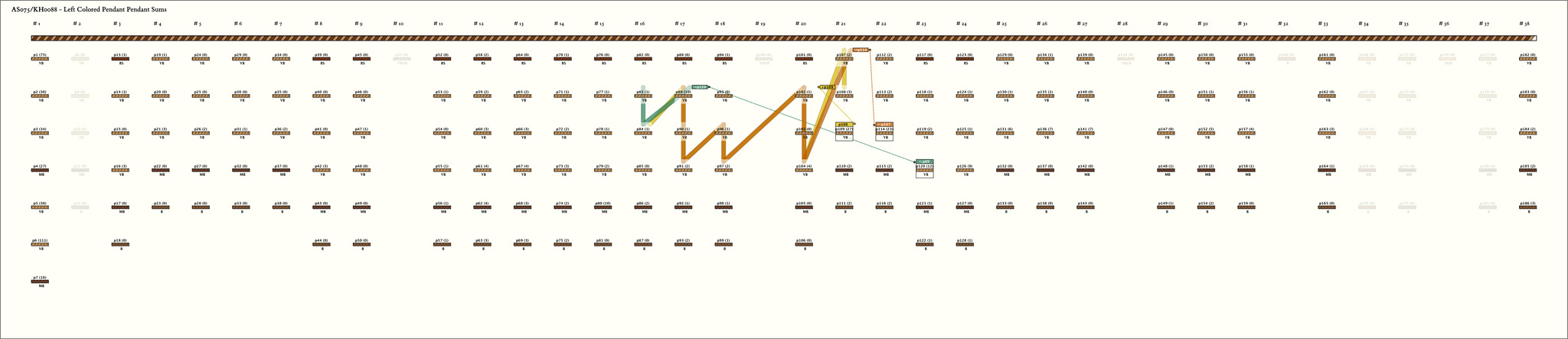 - The pendants in Part I contain as many as two or three values. For example, 3s knots followed by 21 knots followed by 5s knots followed by 21 knots is interÂpreted as 32 then 52. This type of multiple value is only found on this part of the khipu. The 7 pendants in Part I also do not have the same color pattern as the other 32 groups. This part of the khipu seems to be some kind of sunnnary group. Values in it can be associated with values in the other parts in several ways, none of which accounts for all the values. For example 15 & 12 appears on an MB colored pendant--the sum of the MB colored pendants in Parts II & III is 15 and the sum of the MB colored pendants in Parts IV & Vis 12. Also, if the eight groups in Part III are summed position by position, the sums are?, 9, 12, 18, 15, 11. Each of these values is found in Part I.