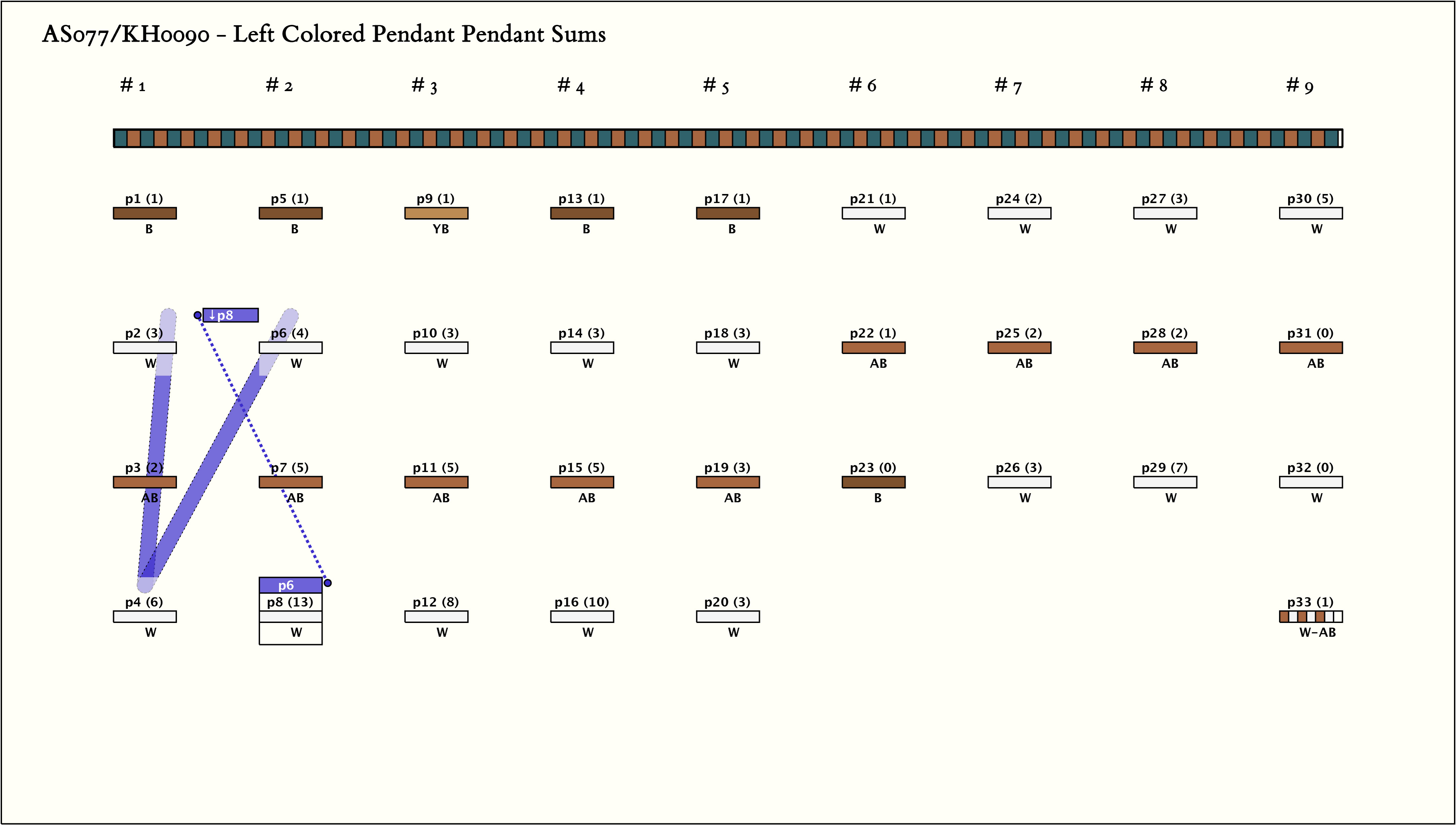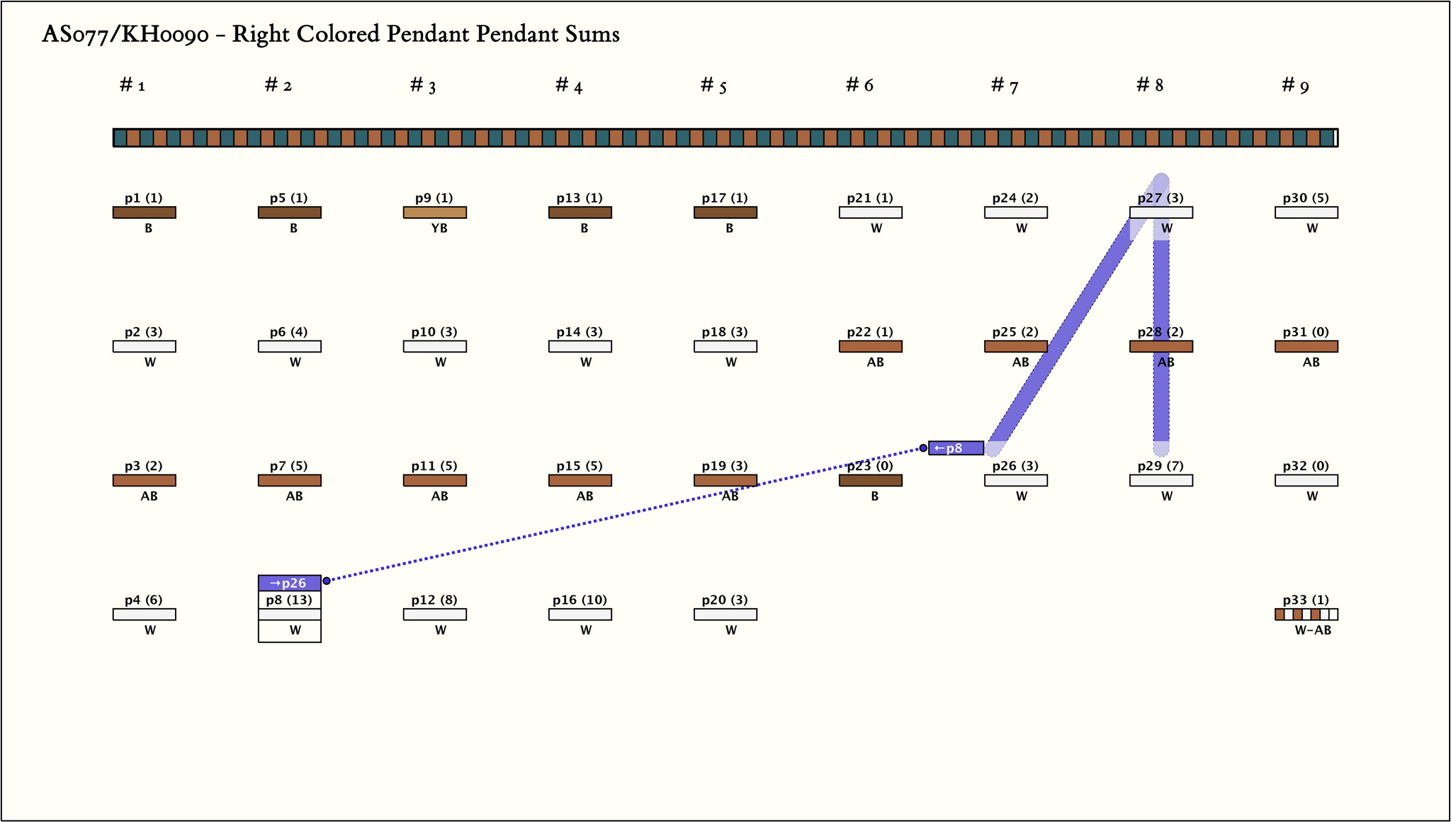 - By spacing there are 9 groups. The first 5 groups have 4 pendants each and, with the exception of the first pendant in the third group, all have the same color pattern (B, W, AB, W). The last 4 groups are basically 3 pendants each (the last has an additional final pendant) and with one exception all have the same color pattern (W, AB, W). Hence, when considered as a whole, all 9 groups have the same color pattern (B if present, W, AB, W) but, by number of pendants in group, the khipu is separated in two parts.