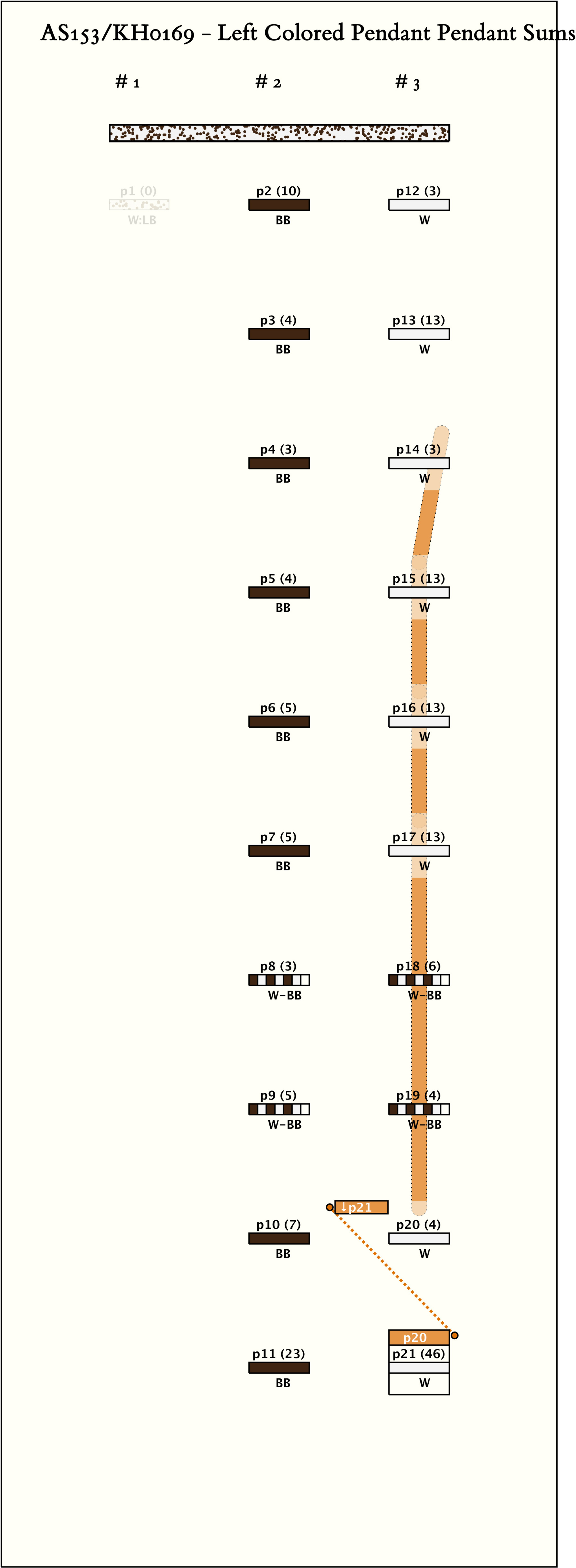 - Both groups of 10 pendant cords have the same color patterning. Each is subdivided into subsets of 6, 2, 2 pendants each. In Group 1 these are BB, BB-W, BB, while in Group 2 they are W, BB-W, W. In both groups, where there is one subsidiary on a pendant cord it is BB and where there is a second subsidiary it is LB in Group 1 and LC in Group 2.