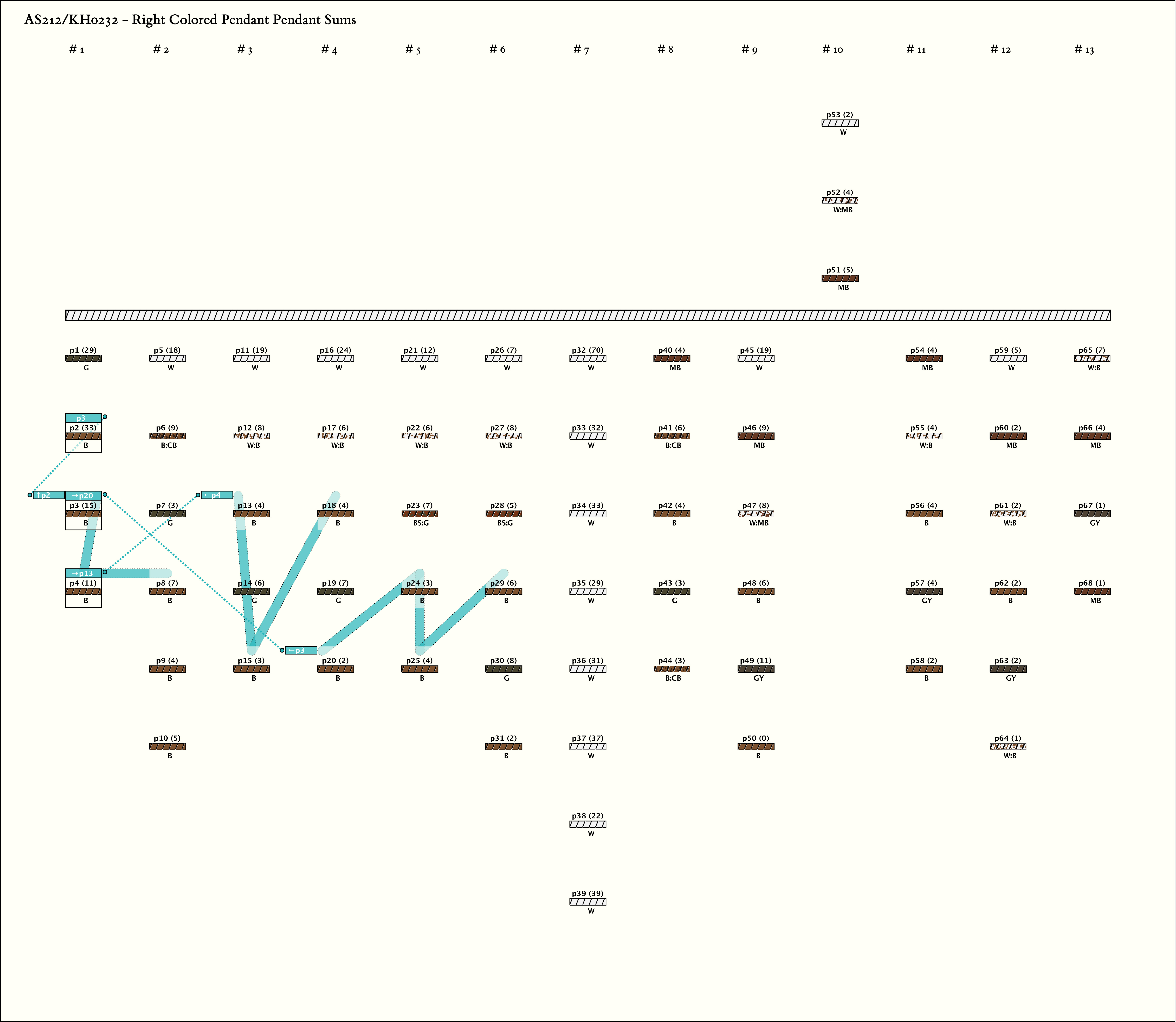 - Each set is a group of 5 pendants followed by a group of 6 pendants. All share a somewhat similar color pattern: W (or not present), MB, (varies), B, G or GY, (varies) with a B subsidiary and W subsidiary on the first and second pendants respectively and one, two, or no subsidiaries of varying colors on the other positions. The two sets can be summarized as: