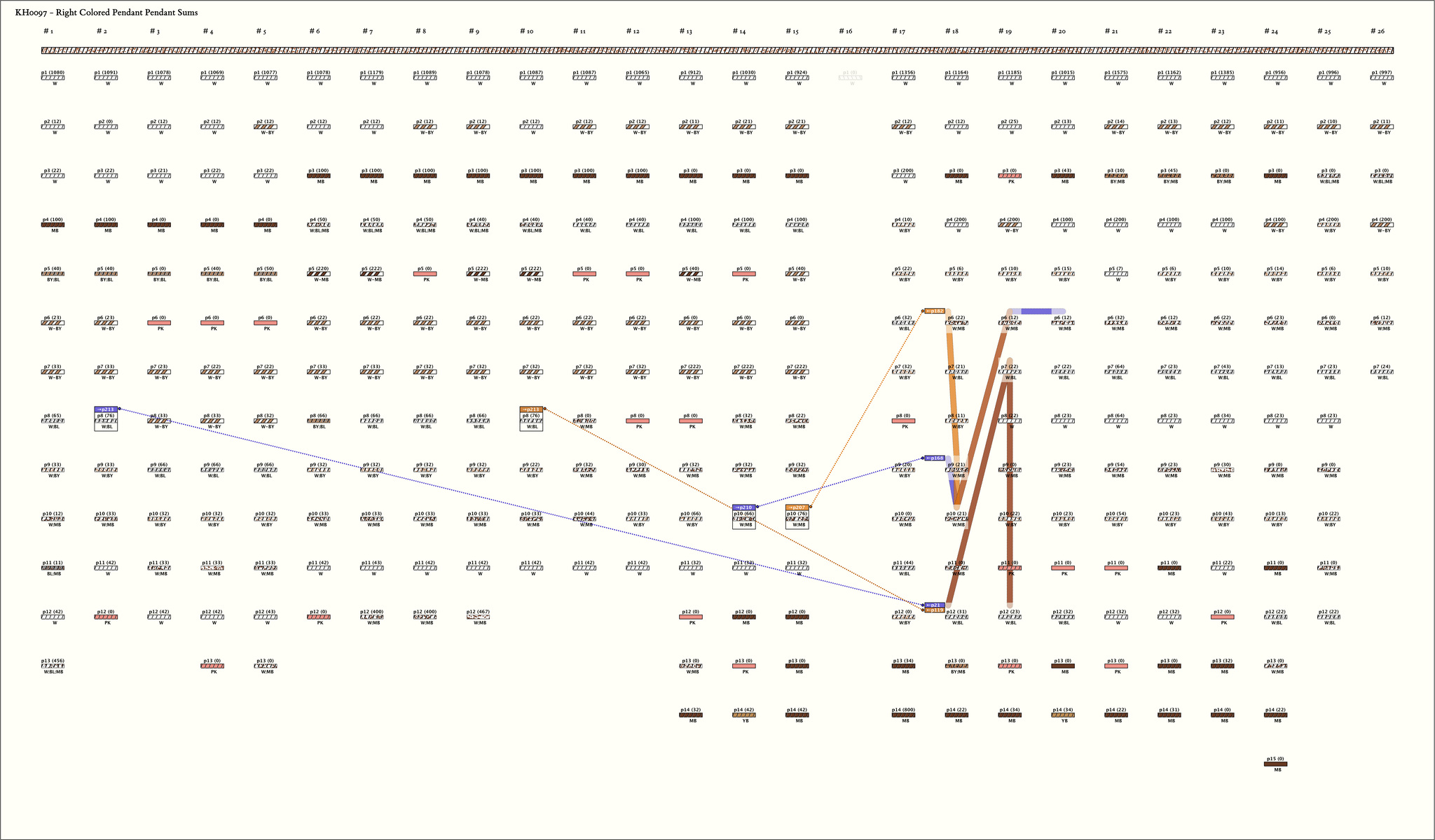 - At first glance, the groups seem to vary in size and color pattern. However, when viewed as groups of 15 pendants with some positions non-existent in each group, the colors and values are repetitions. The 25 groups of 15 pendants have been arranged in a rectangular table (see Table 1). A blank means the position is non-existent, an M is a missing pendant, and a ? indicates that the pendant is broken so the value is unknown. An unequal sign ≠has been used to mark a change in color. Where there is no color change, but just a color anomaly, the value has been grouped with parentheses i.e. (39). Observe from the table that although similarities remain, there are decided differences between part 1 (groups 1-15) and part 2 (groups 16-26). Also, within part 1, there are several changes after the 5th group and after the 12th group.
