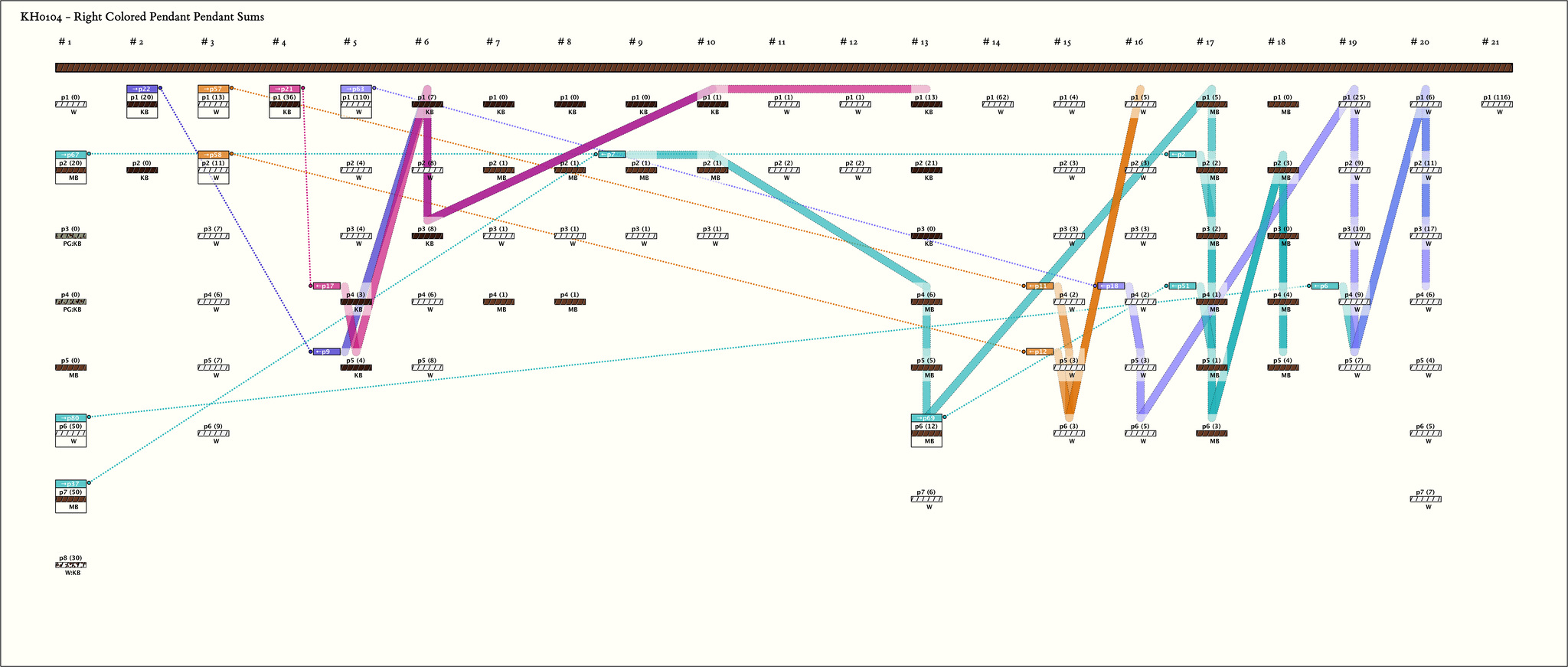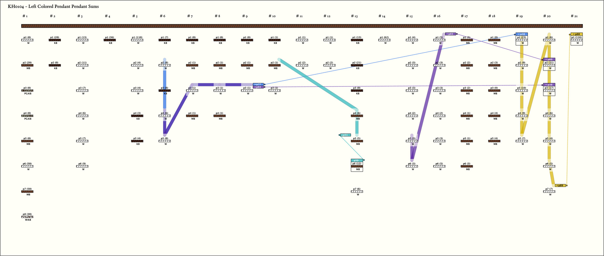 - Groups 4-11 are paired in size and color. The number of pendants per group are 5, 5, 4, 4, 3, 3, 2, 2 respectively. The first 2 of these groups each have 3W and 2KB cords but in different orders; then 2 groups have the color pattern KB, MB, W, MB; the next 2 groups continue this pattern but without the final color (KB, MB, W); and the last 2 groups are both all W. Groups 13-18 are also paired in color: 2 groups are W; then 2 are MB; and then 2 are W.