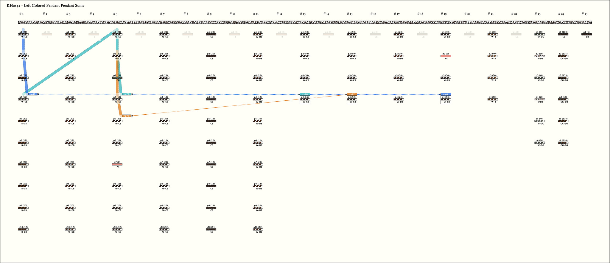 - Each group is unified by color. In part 1: group 1 is CB-W or CB-B; groups 2 and 6 are DB-W; groups 3 and 4 are CB-W; and group 5 is CB. The markers between them are short B cords. In part 2: groups 1, 2, and 4 are CB-W; group 3 is DB-W; and group 5 is B-W. In group 6, 4 of the pendants are GG-W and 2 additional pendants (1 between positions 1 and 2, and the other between positions 2 and 3) are DB:W. In part 3, with the exception of the first pendant, the group is DB-GG.