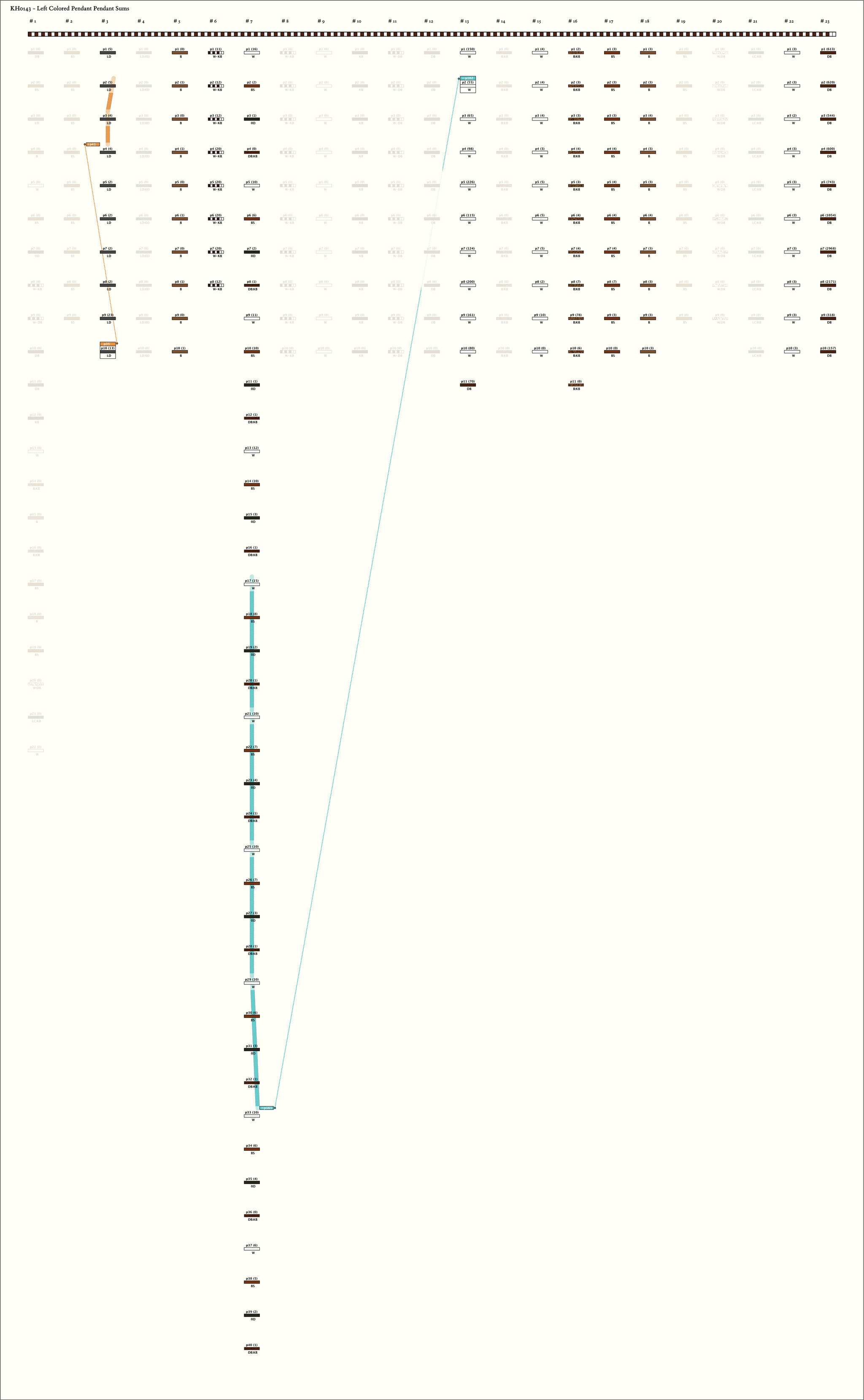 - The 40 pendants in part 3 repeat the color pattern W, BS, 0D, DB:KB 10 times. The only subsidiaries are on the BS colored pendant and all are DB:W. For each of the 10 sets of 4 pendants, the values have the same relative magnitude: W > BS > 0D ≥ DB:KB.