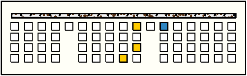 - By spacing and markers, the khipu is separated into 4 parts. The first part is 4 groups, the second and third parts are 5 groups each, and the last part is 1 group. All groups have 4 pendants with the same color pattern: W, LB:W, W, W.