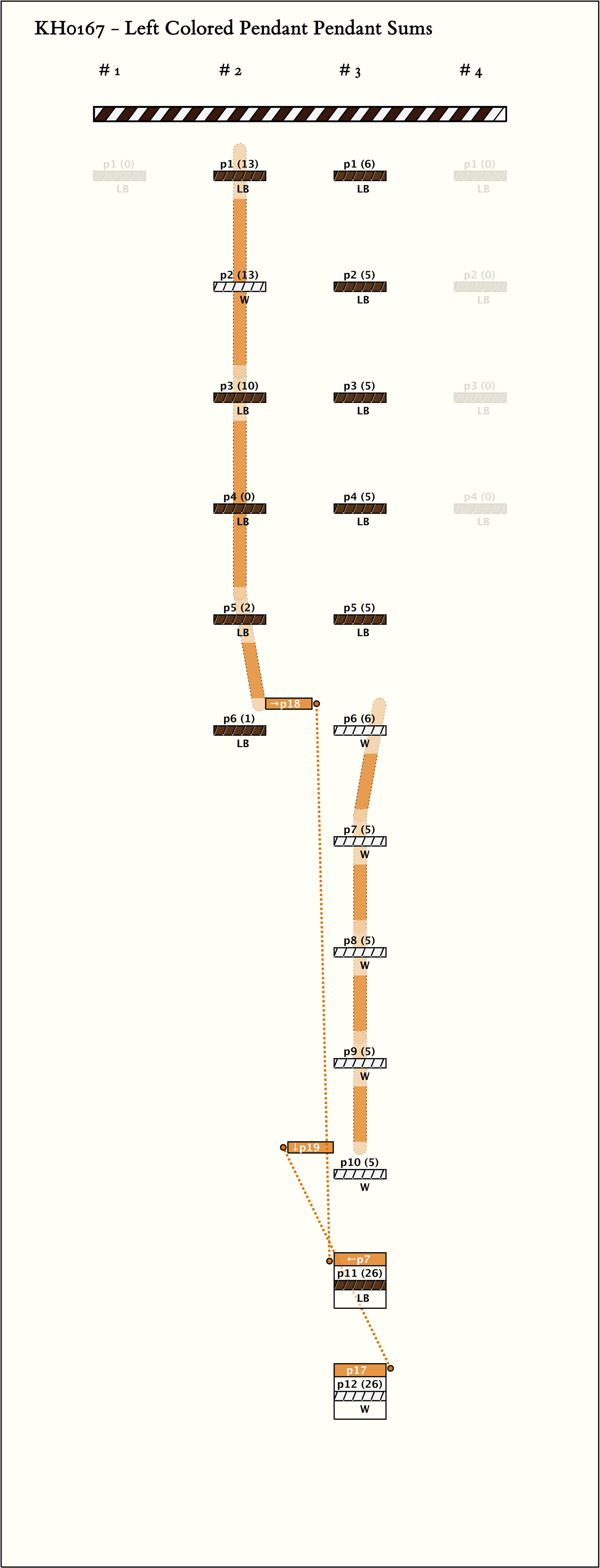 - The 12 pendants of group 3 are 5 LB pendants with LB subsidiaries, then 5 W pendants with W subsidiaries, and then 1 pair of pendants LB, W each with a subsidiary of the same color. The first 5 LB pendant values sum to 26; then the 5 W pendant values sum to 26; and each of values in the last pair is 26. Excluding subsidiaries suspended from subsidiaries rather than from pendants, the subsidiaries also sum to 26.