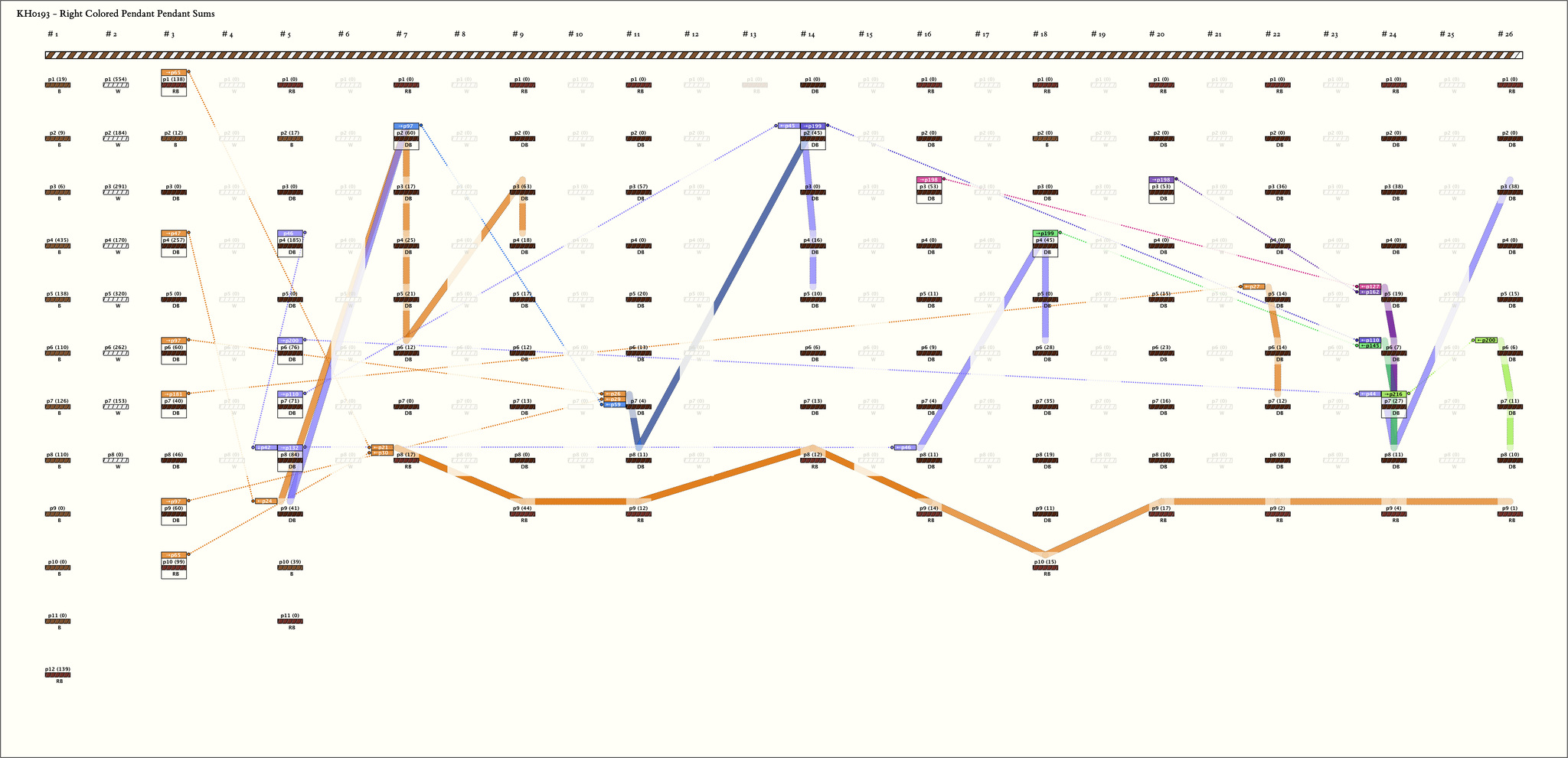 - By color, the khipu is separated in 25 groups. The first group is 12 pendants. Then there are 24 groups alternating in color pattern. Basically the pattern is a group of 8 pendants color W, followed by a group of 9 pendants colored RB, 7 DB, RB. (The exceptions t o the pattern are: groups 3, 5, and 17 each have an additional pendant between positions 1 and 2; groups 5, 7, and 9 each have an additional pendant between positions 8 and 9; in groups 7 and 9, position 4 is non-existent; and in group 7, position 2 is also non-existent. ) Starting with group 4, all groups of W pendants are of value 0 (or blank) and, in the alternate groups, all values in positions 1, 2, and 4 are 0 (or blank).