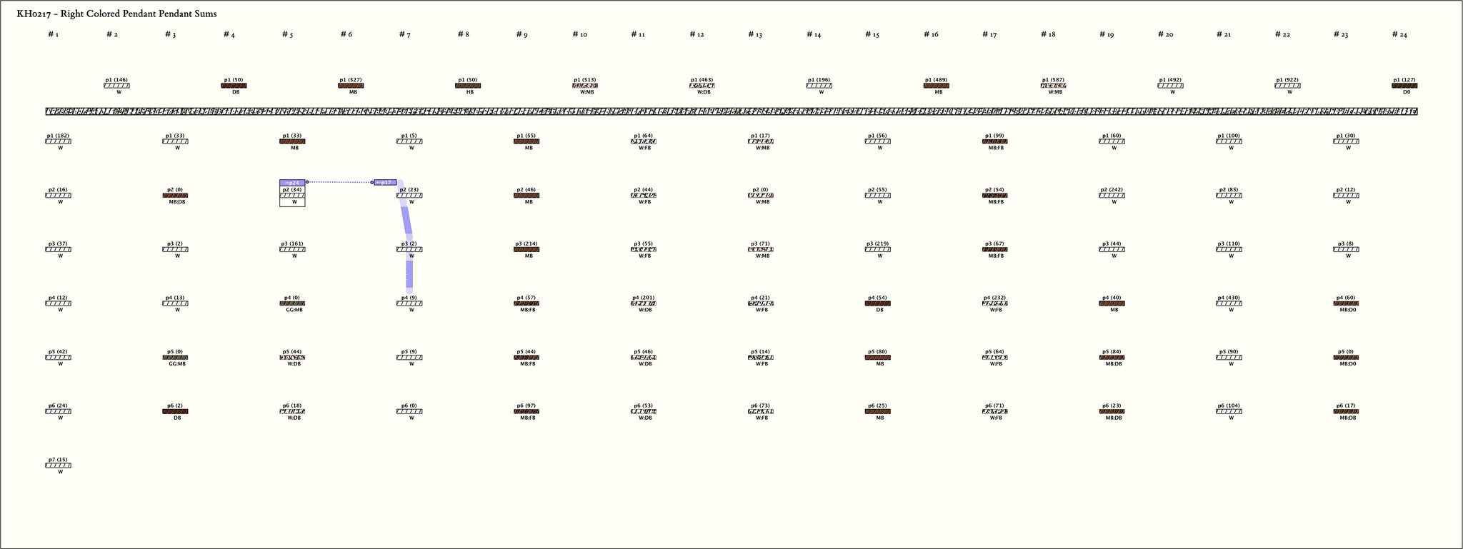 - Within groups 1, 4, and 11, all pendants and the top cord are the same color. Within groups 5, 6, 7, and 9, the first 3 pendants are one color, and the next 3 are another color. In 3 of these 4 groups, the top cord color differs from both the pendant colors. Within groups 8, 10, and 12, the first 3 pendants are one color and the next 3 are mixed. Within groups 2 and 3, the pendant colors are mixed. In 4 of these latter 5 groups, the top cord is one of the colors in the pendant group.